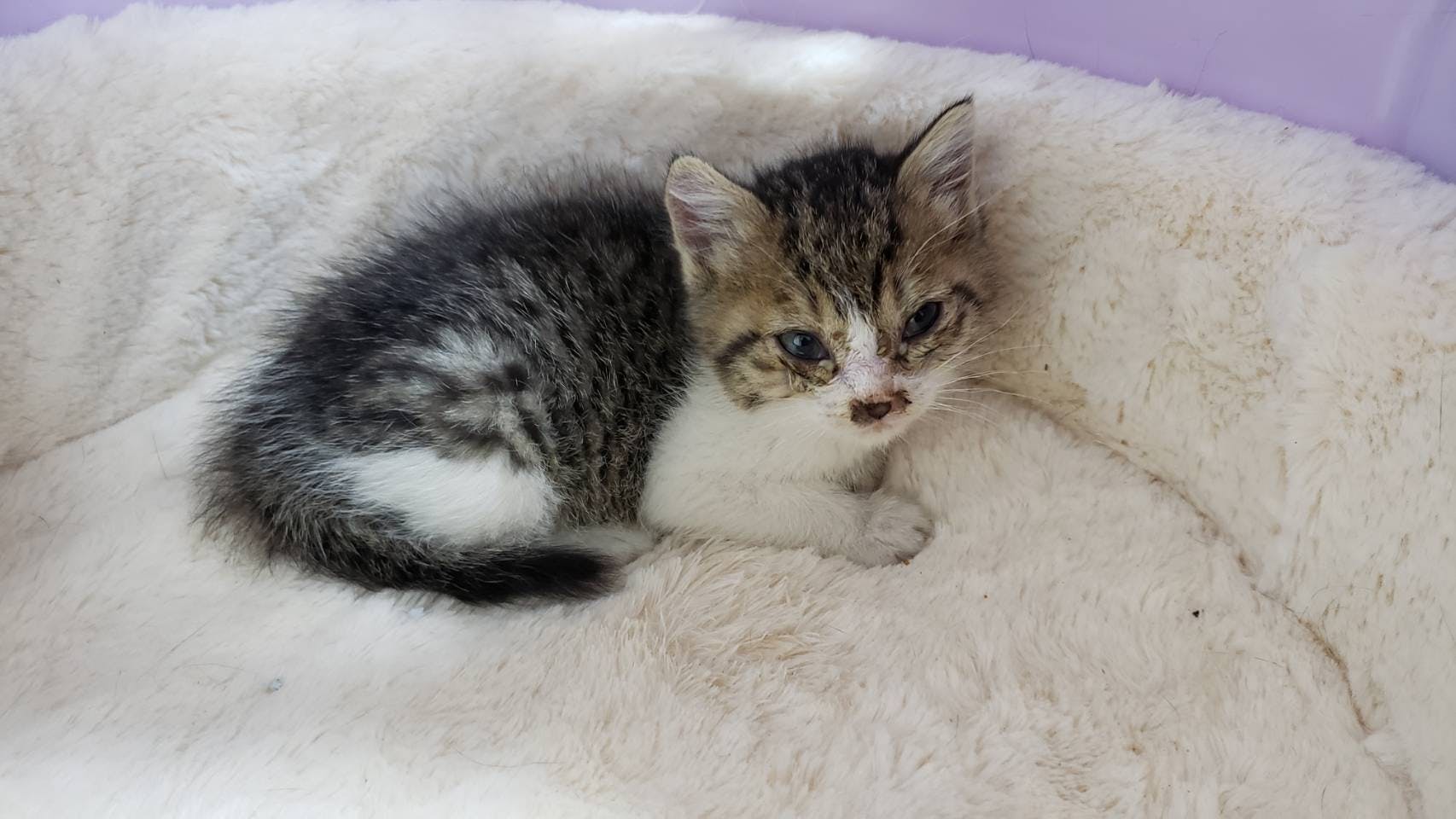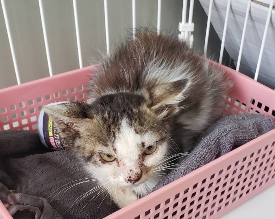 ▲保護時、近くに母猫がおらず、雨ざらしになっていて低体温で風邪をひいていた子猫。