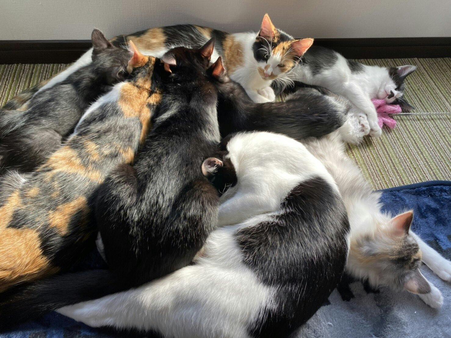 ▲様々な理由から保護した猫たち。みんなの居場所となるように。新しい家族を待っています。