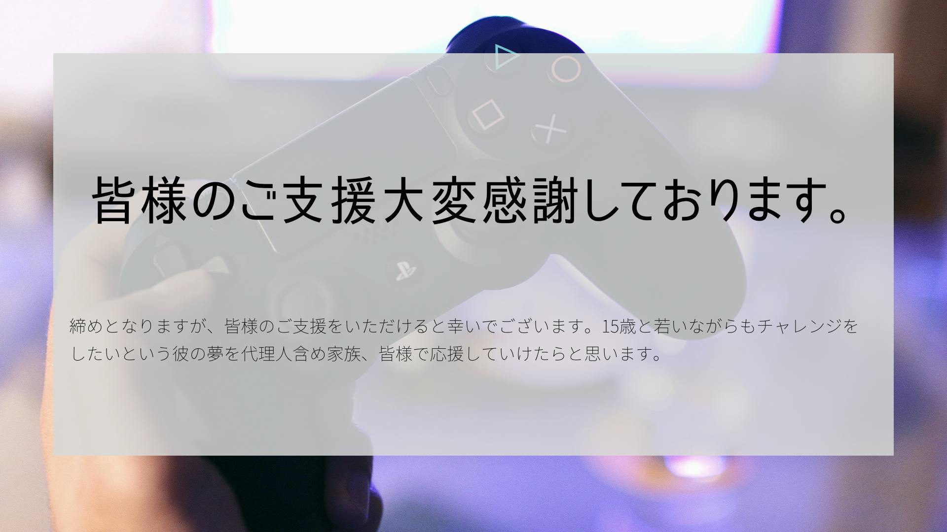 僕は沖縄で生まれ、沖縄に住んでいる15歳です。小さな頃からゲームが好きで自分が覚えていない頃からゲームをしてきました。eスポーツが注目されている世界ですが、それ以外のゲームも沢山あります。RPGだとか…。そこでゲーマーがどうにかゲームをすればするほどお金が作れるシステムを作れないかと考えていました。そこで今回、CAMPFIREで僕が起業するための資金を集めたいと思っています。