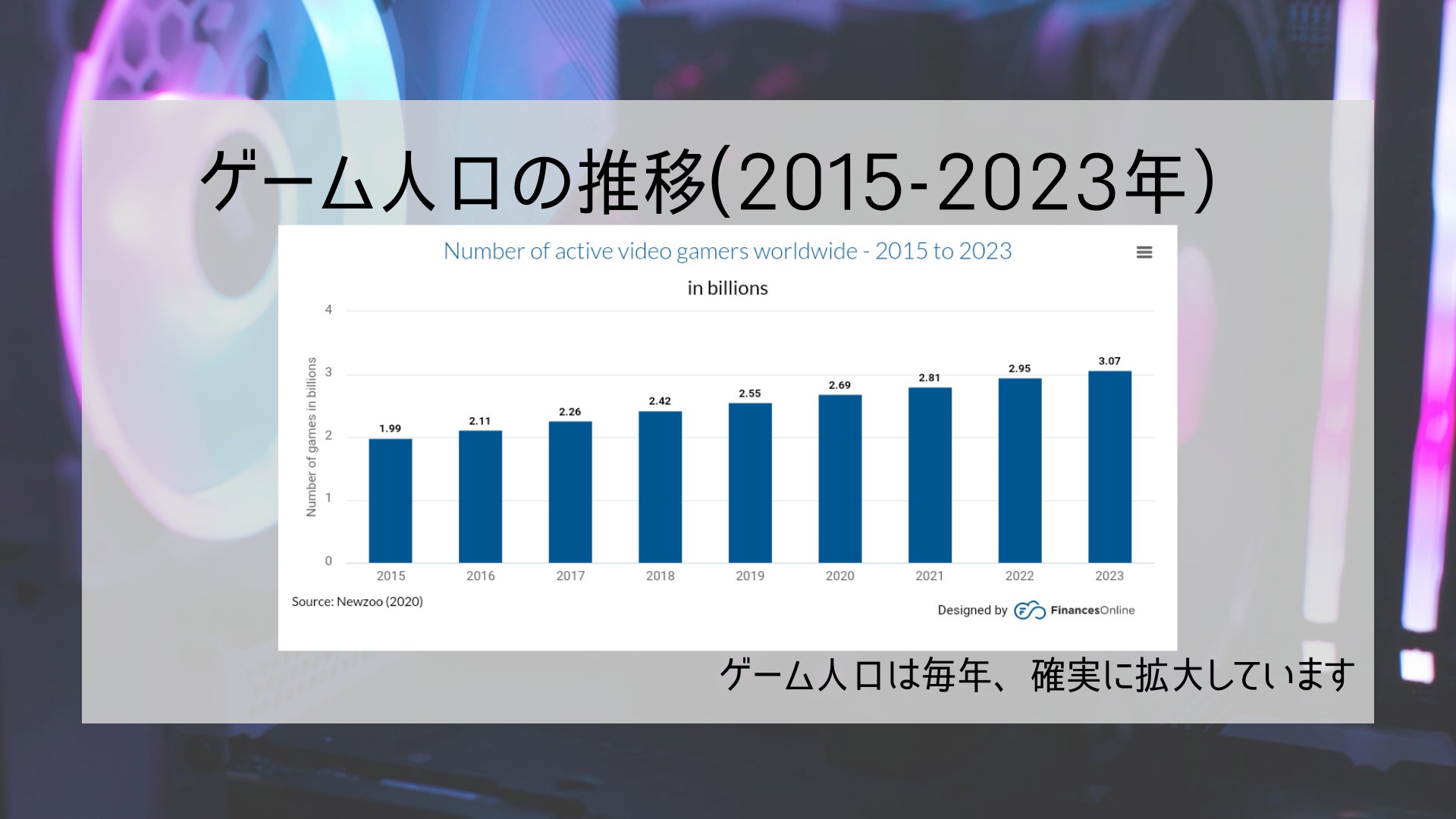 世界のゲームプレイヤー人口は2020年現在27億人いると推定されております。(Global Games Market Report)人口は、増える一方でございます。