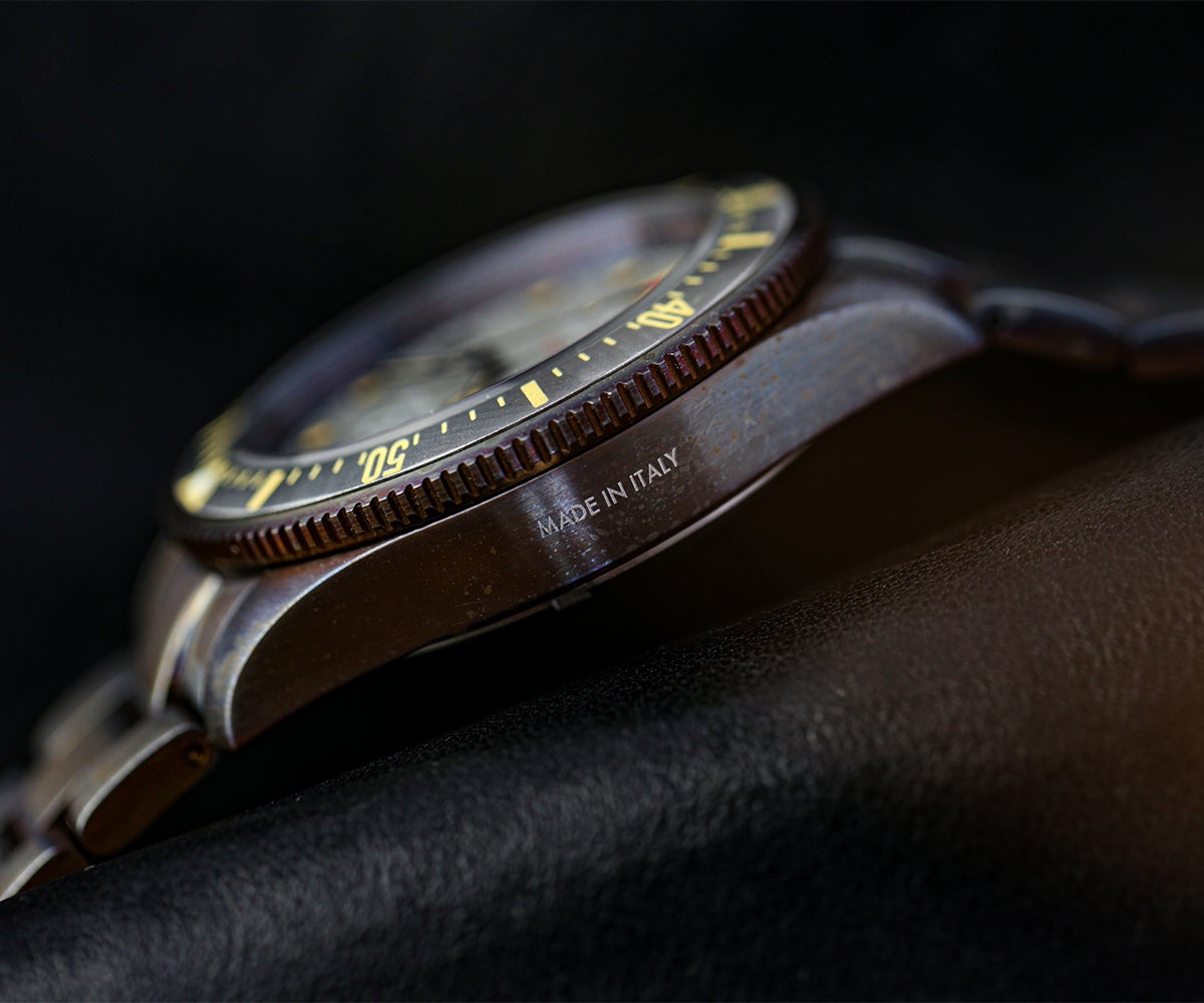 イタリアの職人が1点づつ手作業でこのエイジング加工を施し、他の高級時計とは一線を画しています。