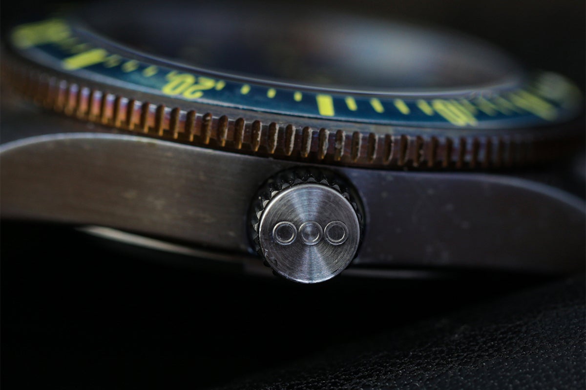 独自のエイジング加工が施されたアルミニウム製回転ベゼル上の時刻インデックスと針部分には