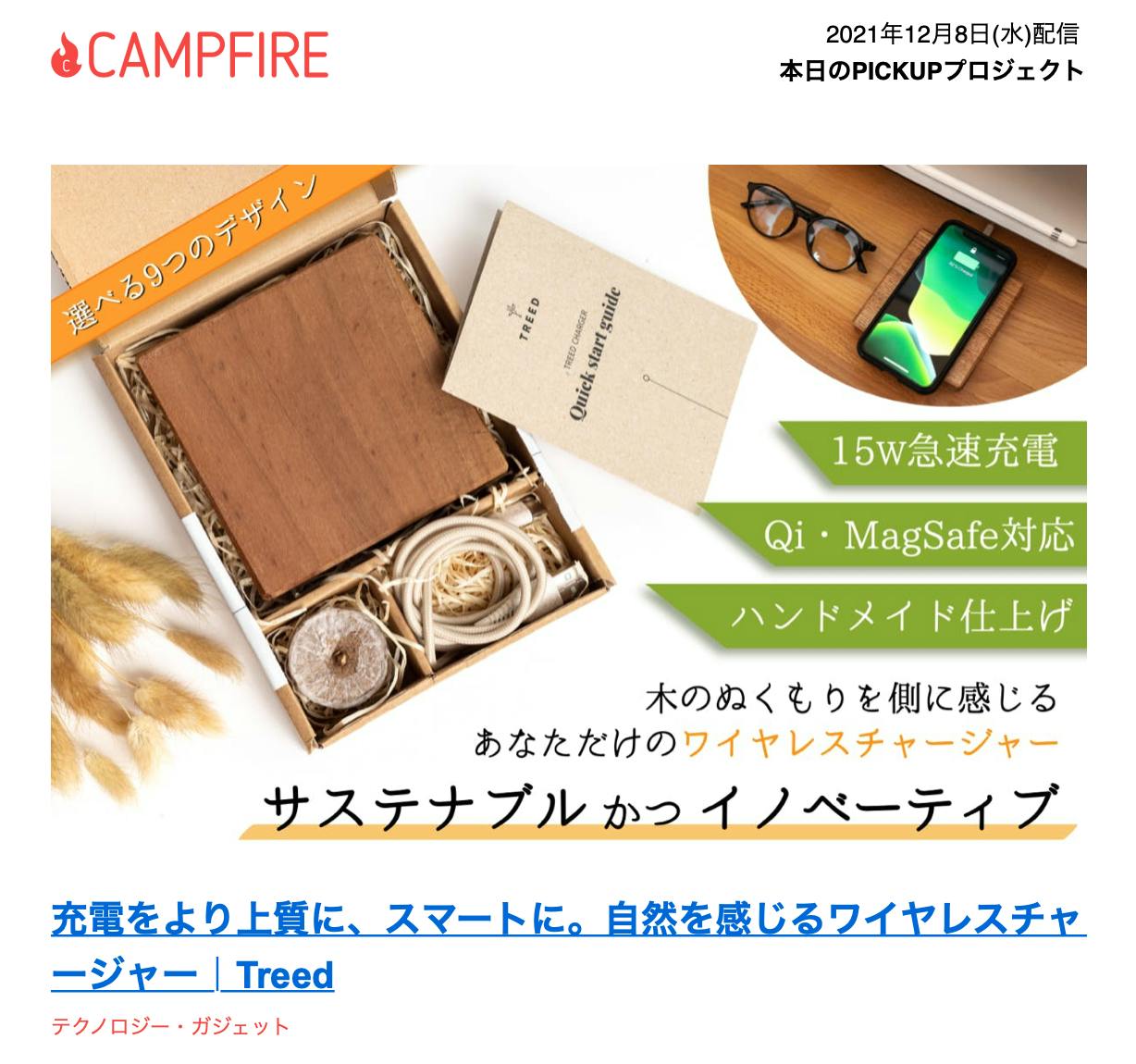 12月8日のCAMPFIREニュースレター内、「本日のPICKUPプロジェクト」にてTreed Chargerが掲載されました!