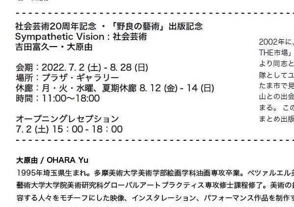 2022/06/26 07:00【映像展ご案内】社会芸術20周年記念・「野良の藝術」出版記念 Sympathetic Vision:社会芸術 吉田富久一・大原由 @ プラザ・ギャラリー(調布仙川)7/2(土)~8/28(日) 東京都調布市仙川のプラザ・ギャラリーにて昨秋に開催した野良の藝術野外展での映像作品を発表します。制作:大原由7/2(土)15:00~18:00 には出版記念を併せた簡素なパーティをします。ご都合つきましたら参加お待ちしてます~。詳しくはギャラリーHPで http://www.plaza-gallery.com/出版物情報:https://www.kinokuniya.co.jp/f/dsg-01-9784878895326 もっと見る