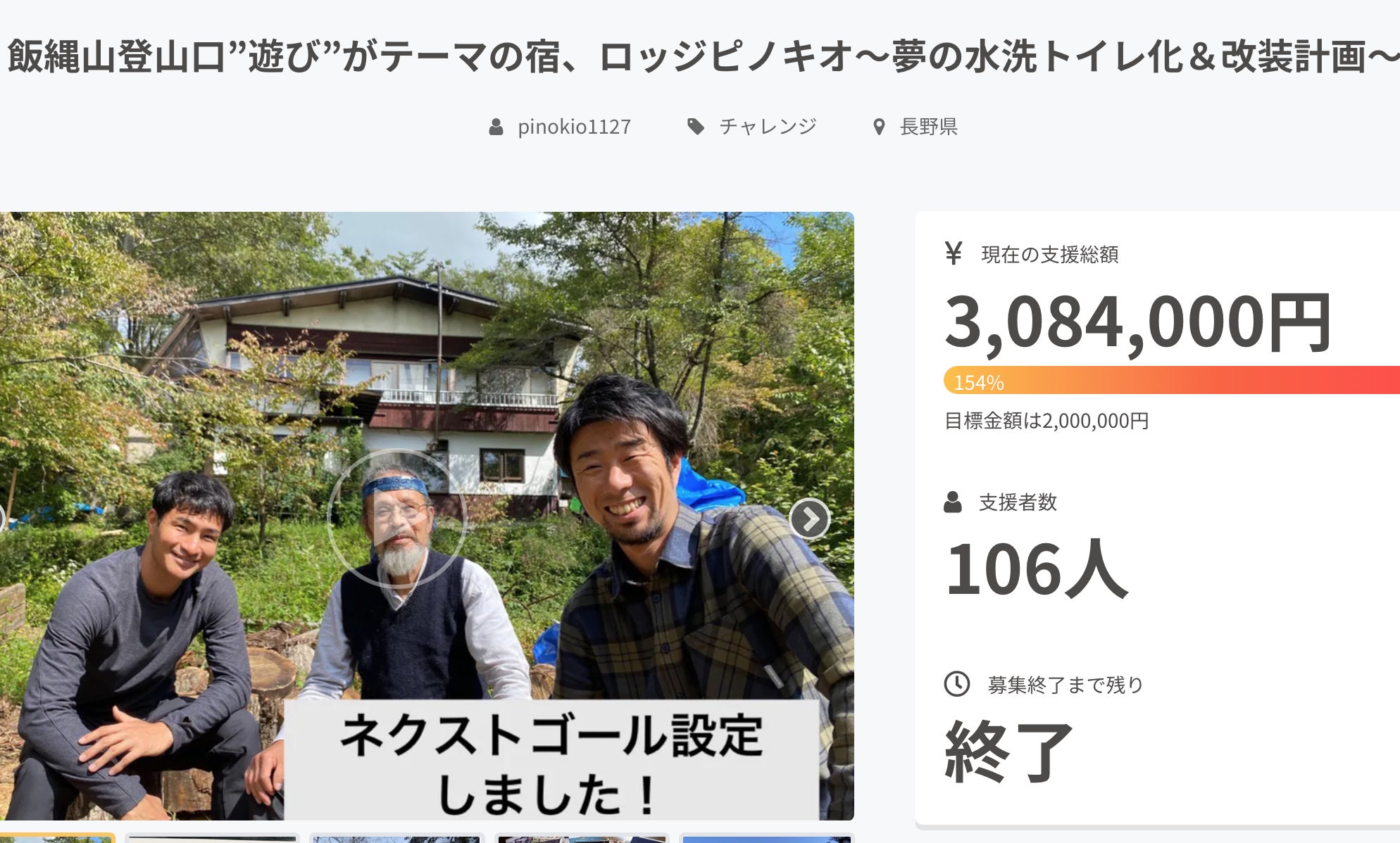 2021/12/02 04:2810月15日より行ってきたクラウドファンディングですが、11月30日をもって終了しました。ネクストゴールの300万円も達成することができ、最終的には106人もの方に支援いただき3,084,000円集まりました。本当にありがとうございます。改修工事も大詰めを迎え完成が近づいています。完成箇所は随時報告します。今後ともよろしくお願いします。ロッジ ピノキオ園原 遊 もっと見る