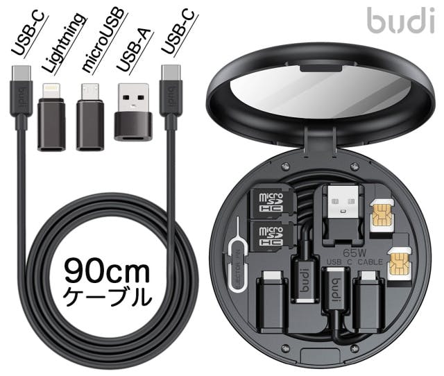 budiシリーズではお馴染み、付属ケーブル「USB Type-C to C (PD65w)」と変換アダプター「USB-A」「microUSB」「Lightning」を組み合わせる事で6種類の接続端子に接続可能!