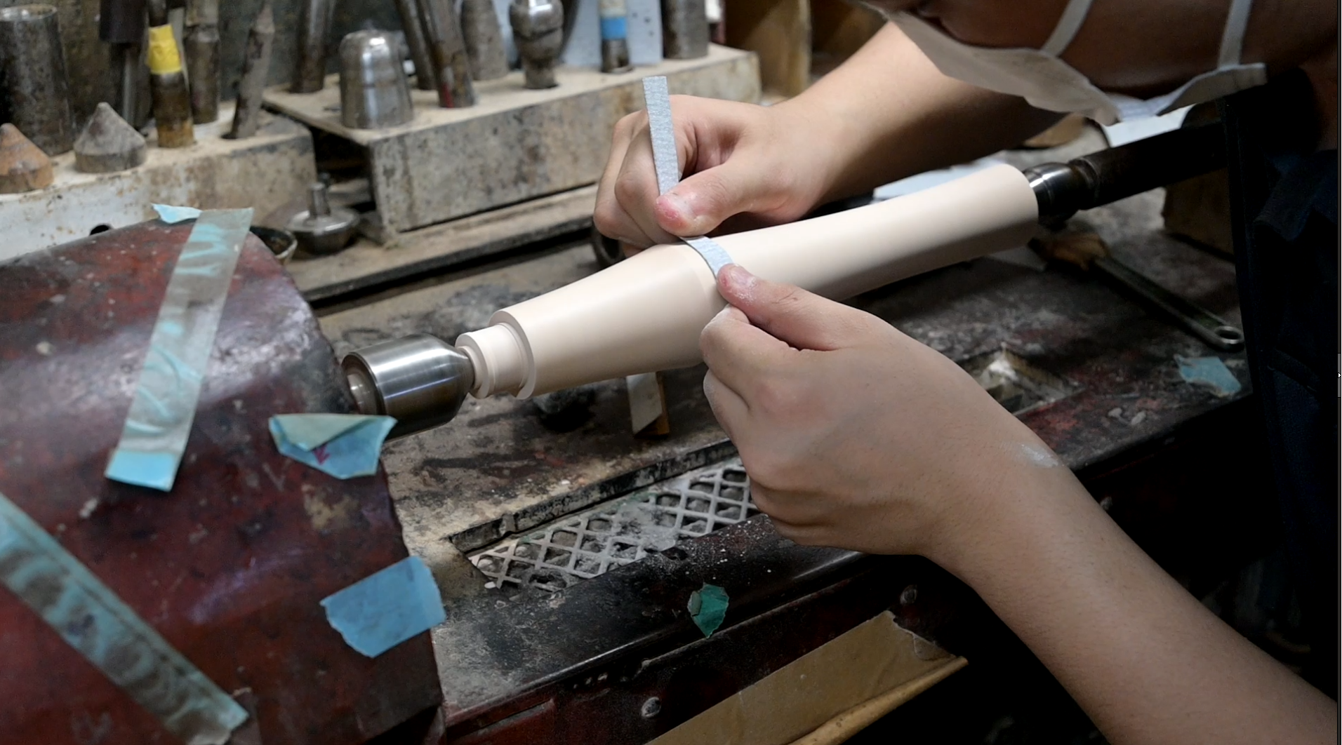 木製尺八製造工程:研磨作業制作にあたって、デザインと量産のための形状、音色を両立させるためには図面も実物も何度も調整を繰り返す必要がありました。