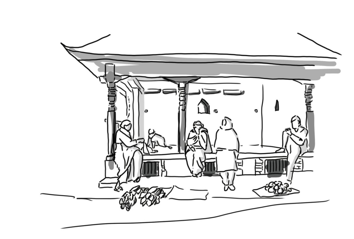 広さ8帖ほどの屋根と柱だけの開放的な空間で、野菜を広げて商売をする人、楽器を演奏する人、その隣では子供が遊んでいたり、道行く人がふらりと立ち寄って休憩したり....。住民が好き好きに利用しています。街角の屋根のかかるシンプルな空間が、人と人をつなぐキッカケとなっていました。