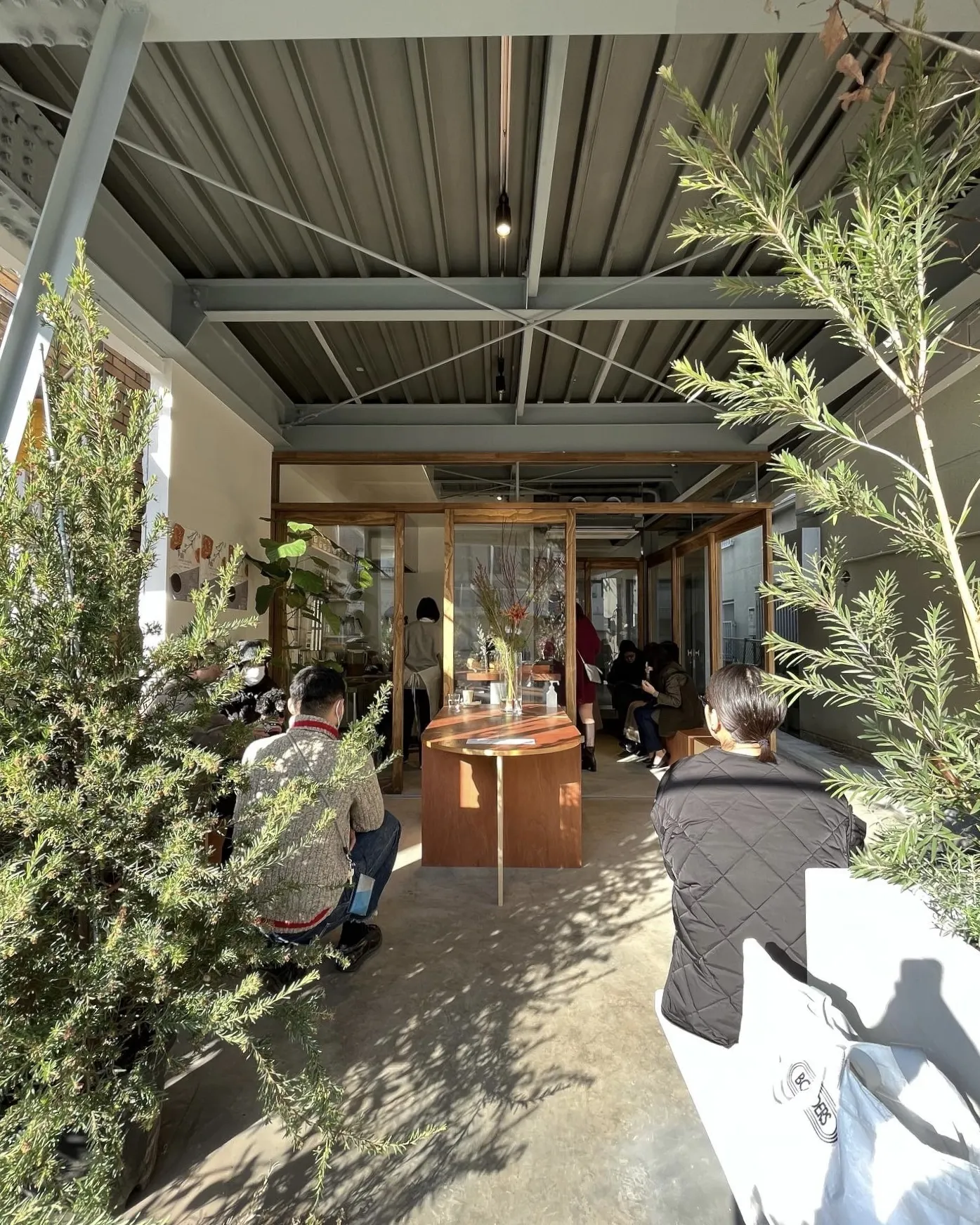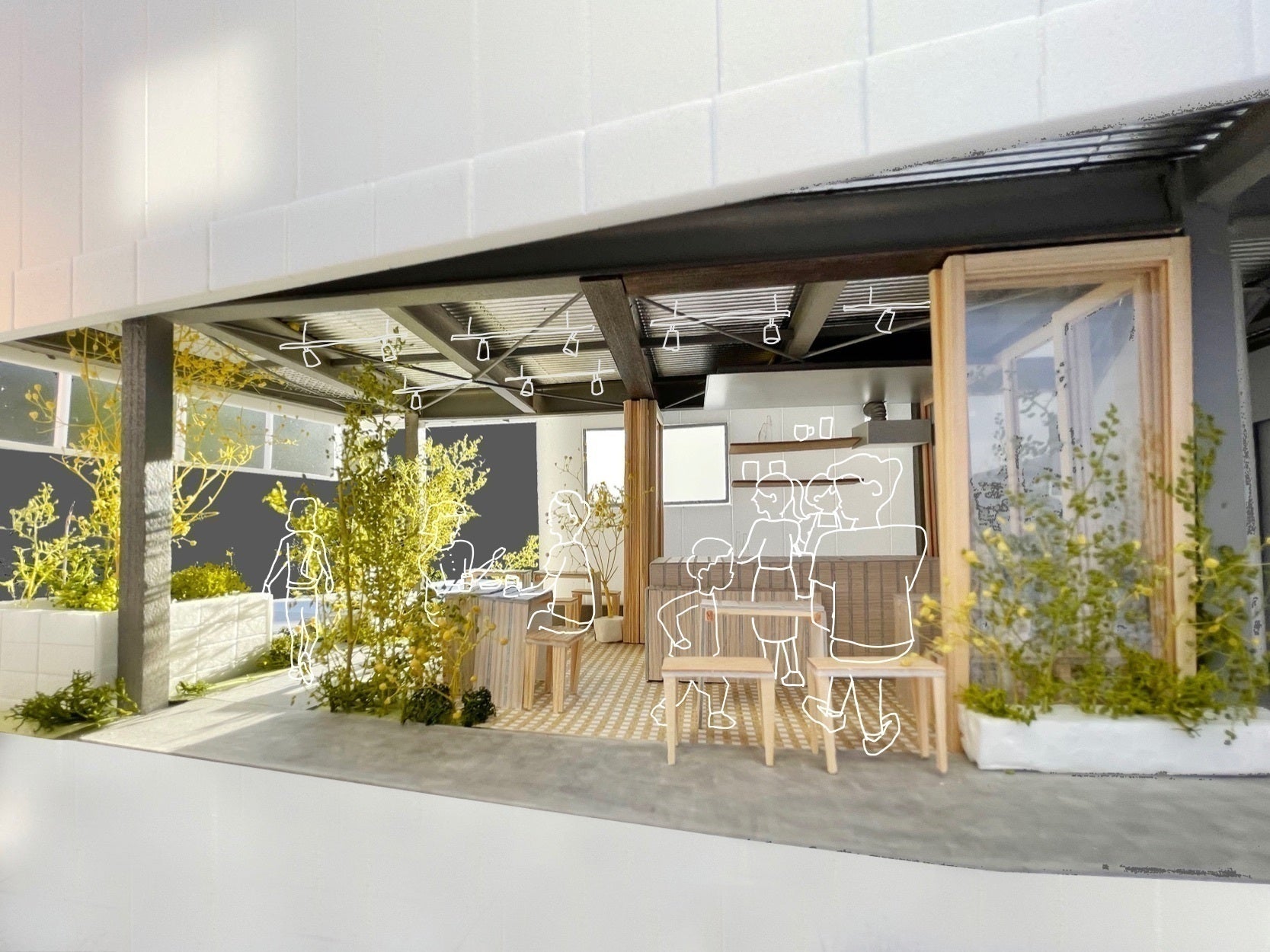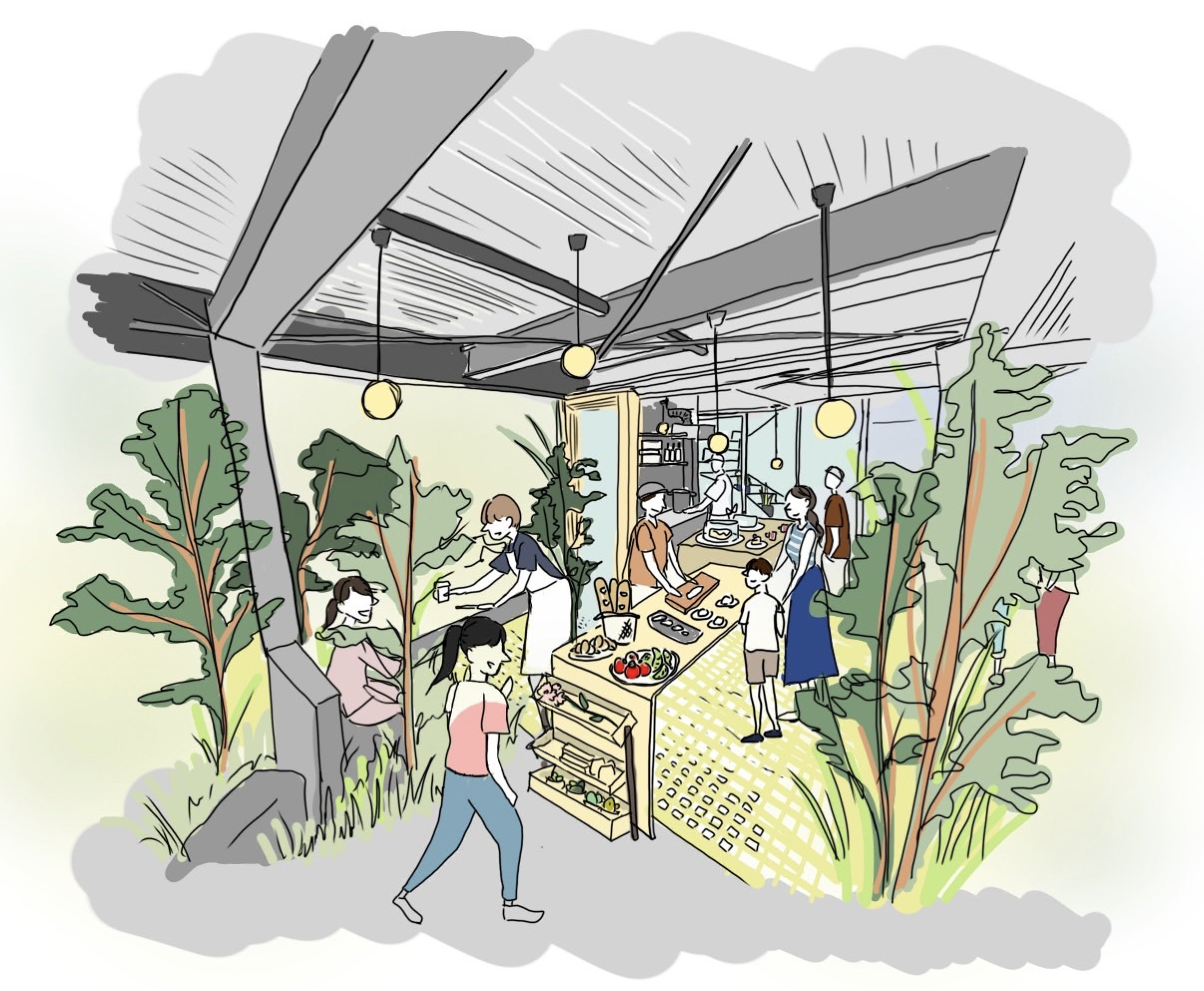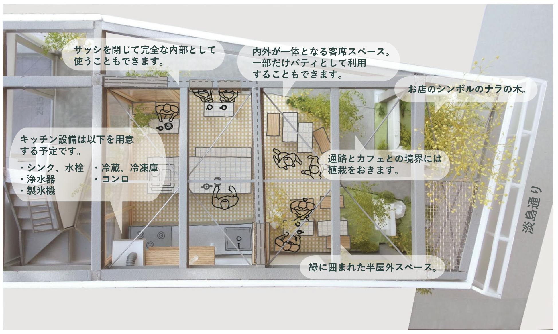 店頭にはシンボルとなるナラの木を植え、その周りにたくさんの緑を植えます。緑に囲まれた店内は、大半を屋根の下の屋外とし、小さな公園のような居場所となります。