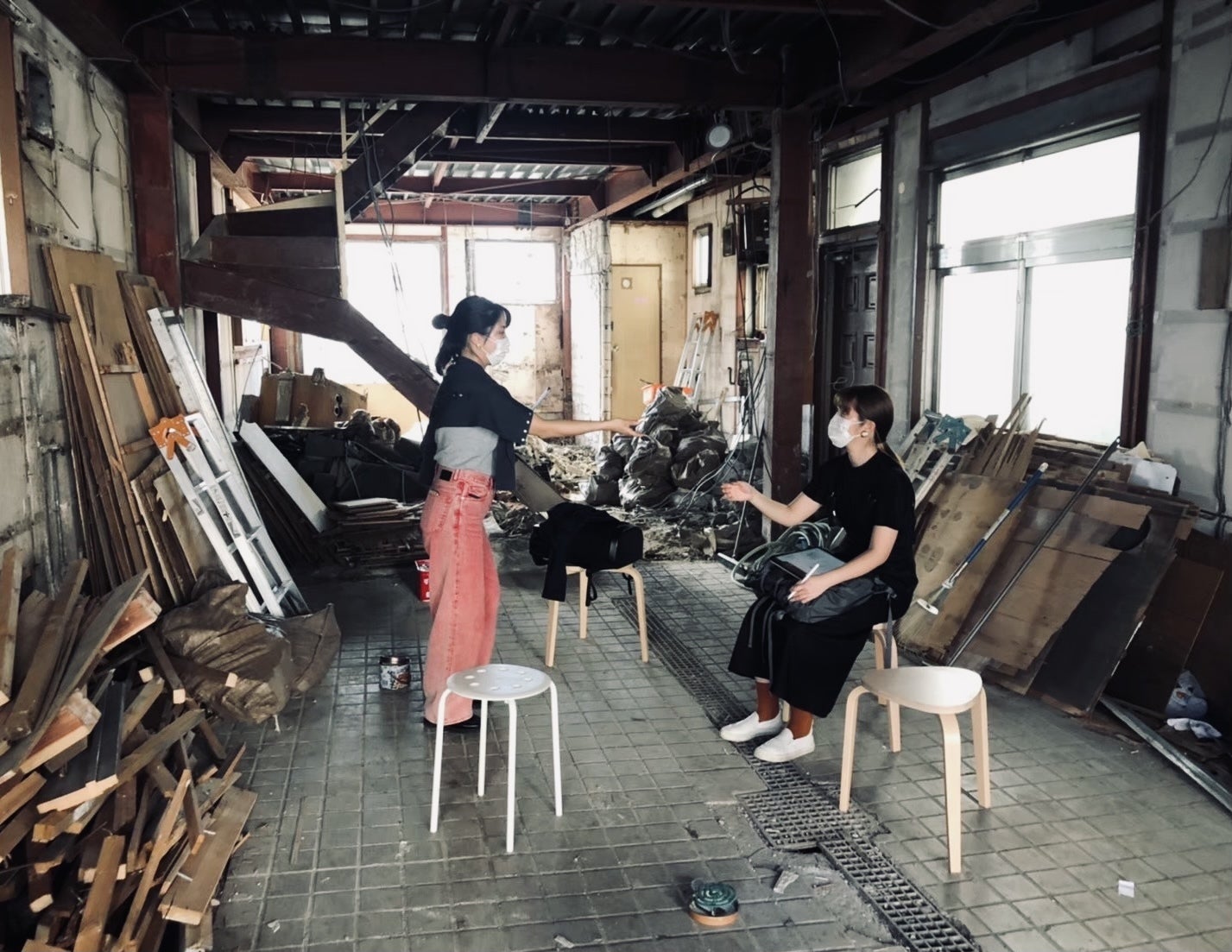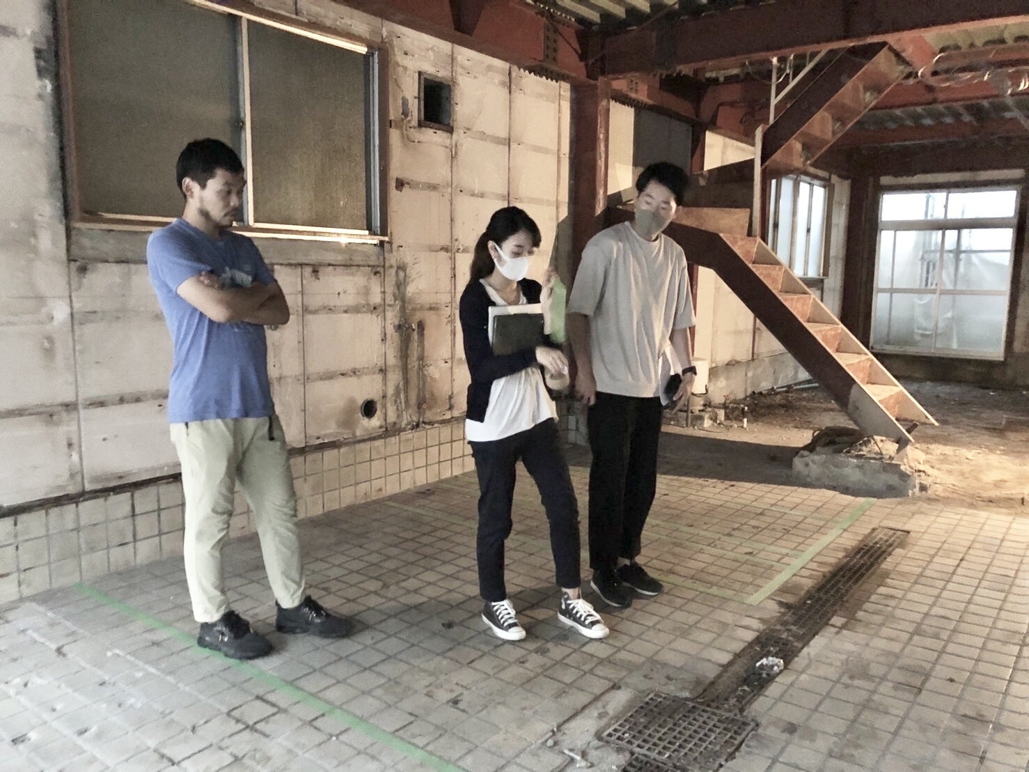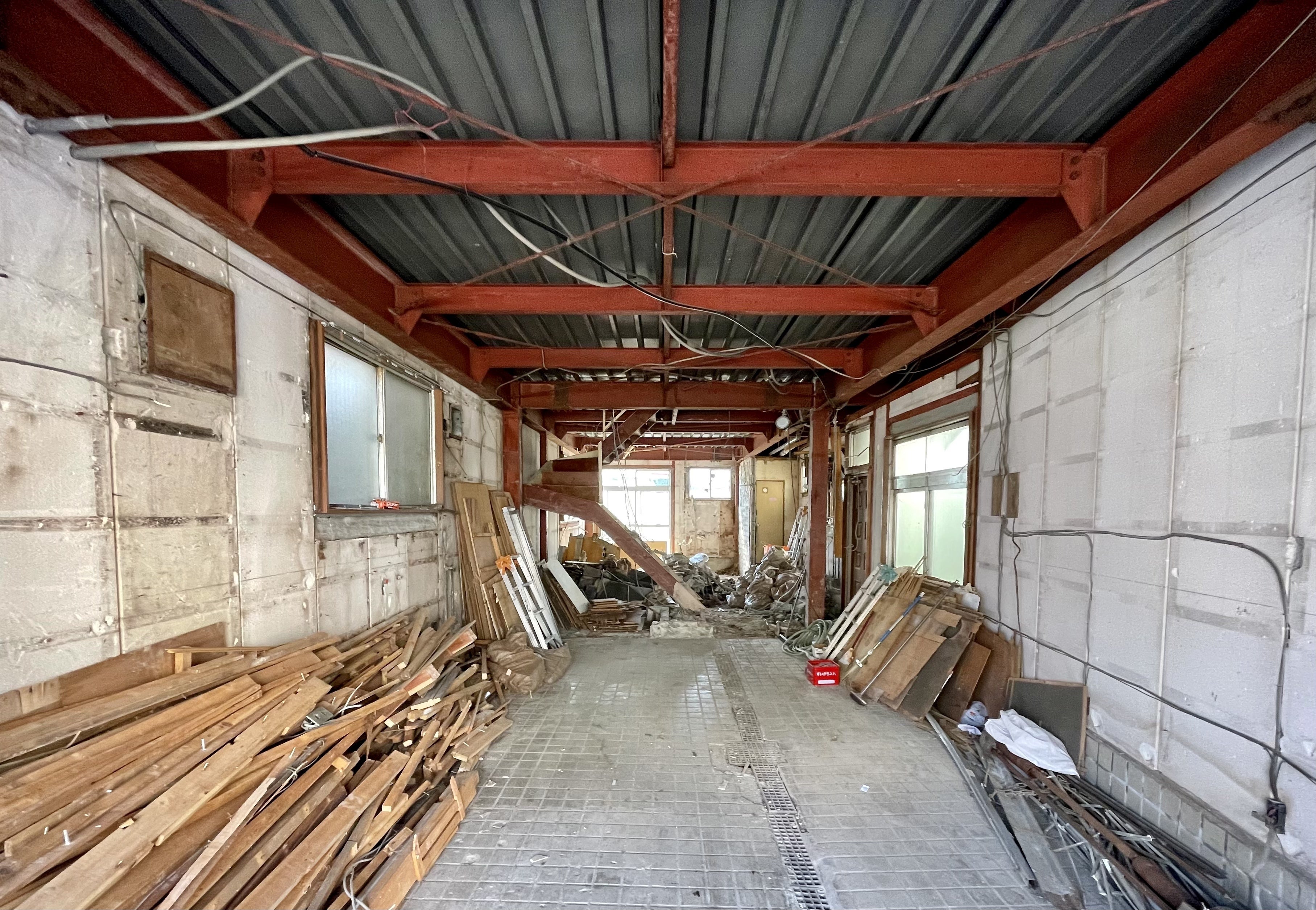 写真は計画初期の頃。元の建物は店舗(かまぼこ店)兼住宅でした。内装を解体して、スケール感を確かめながらアイデア出しをしていきました。