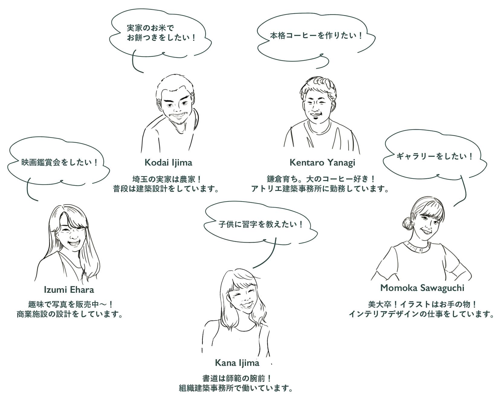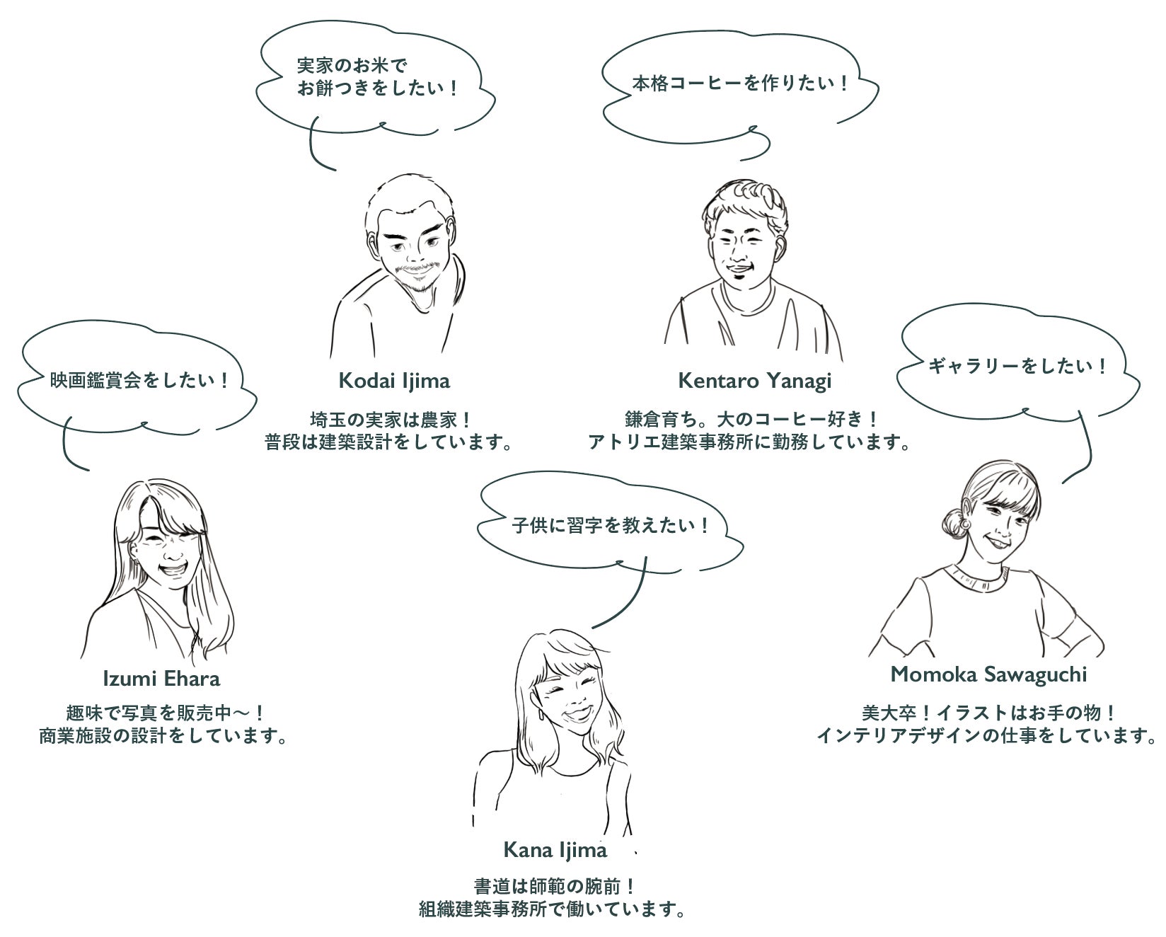 私たちは、普段は設計事務所やインテリア事務所で働いている5人の会社員です。