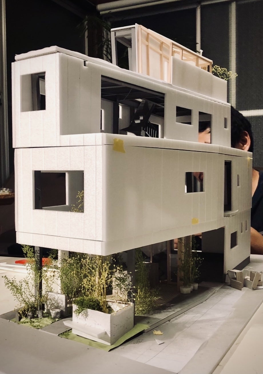案の方針が決まり、建具や家具のスケール感、建材や素材は模型での検討が必要なため、1/25スケールの模型を作成しています。