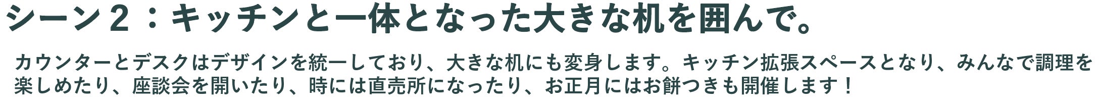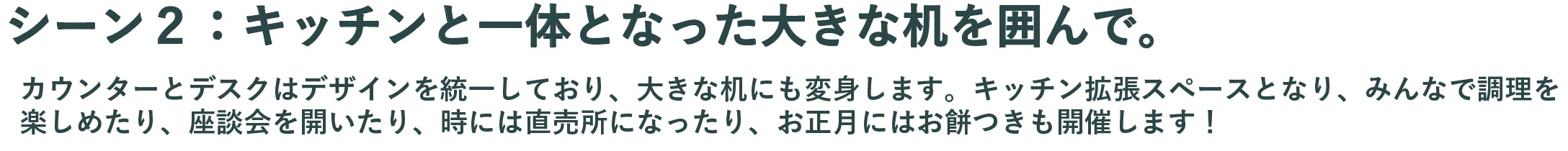 また、コーヒーを提供しているカウンターと飲食用テーブルを同じデザインで統一しており、イベント時にはそれらをつなぎ合わせ、一体感のある大きなキッチンテーブルとして使用することができます。