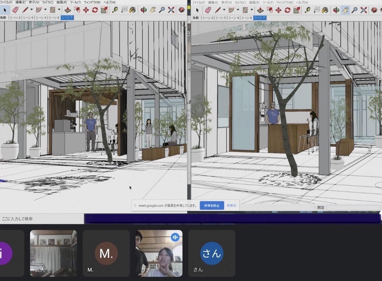 自粛期間であったため、休日にWeb会議を活用して、様々な案を3Dモデルにより検討し方針決定をしました。写真はベースプランが決定した頃です。