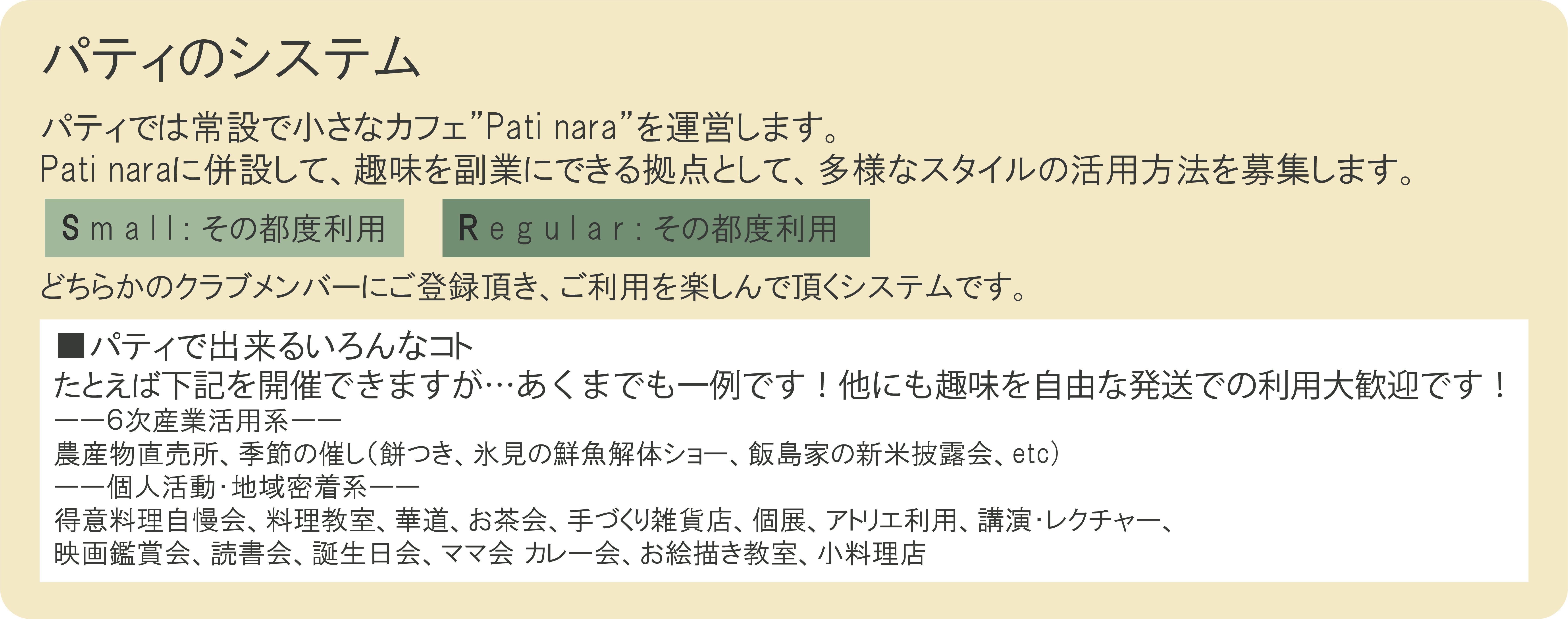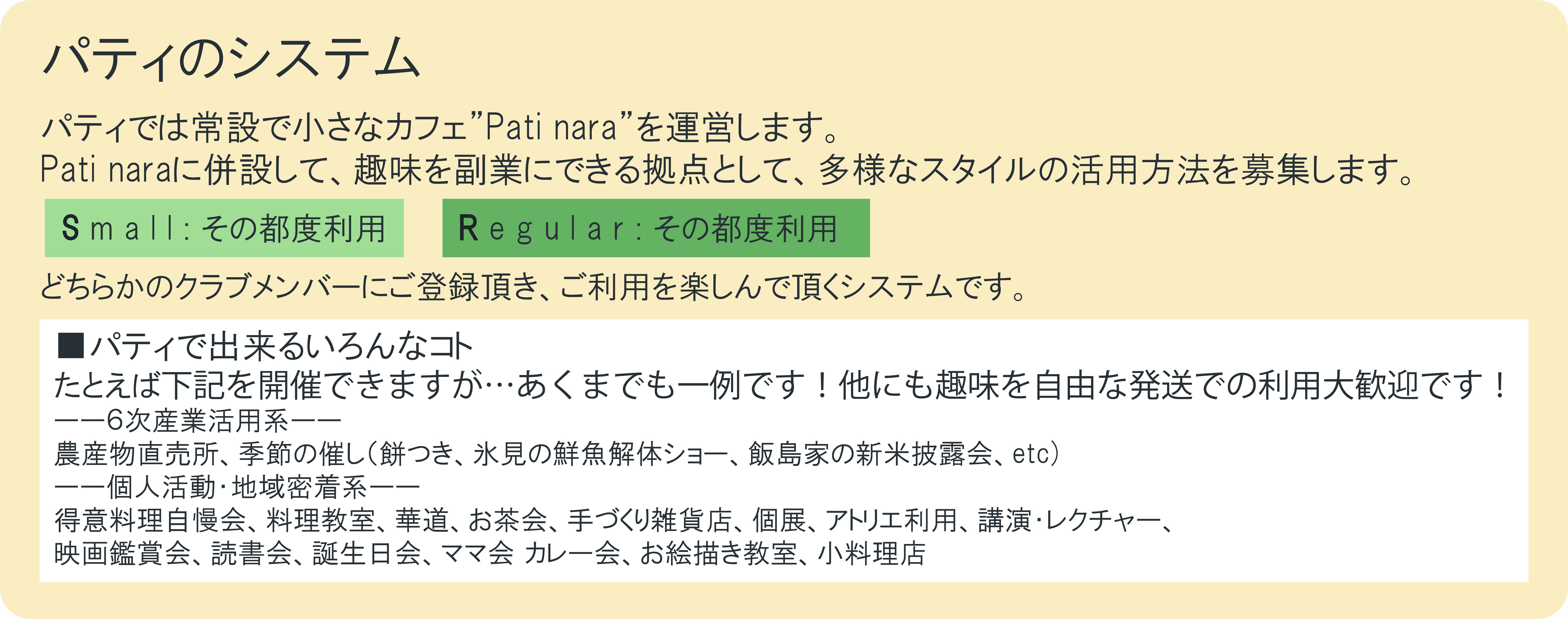 東京郊外と都内をつなぐ、6次産業を構築していくための拠点として発展していくことを目指しています。 東京郊外の農家の方が、キッチンで農作物を加工し商売のできる場所となる一時的な都内拠点として利用ができたり、これから活躍していくアーティストが、表現や発信ができるギャラリーとしても活用できます。そして、それらが共鳴して新たな産業が生まれる事にもつながると思っています。Patiでは、定期的なフリーイベントを催して、6次産業のバックアップをしていきます。