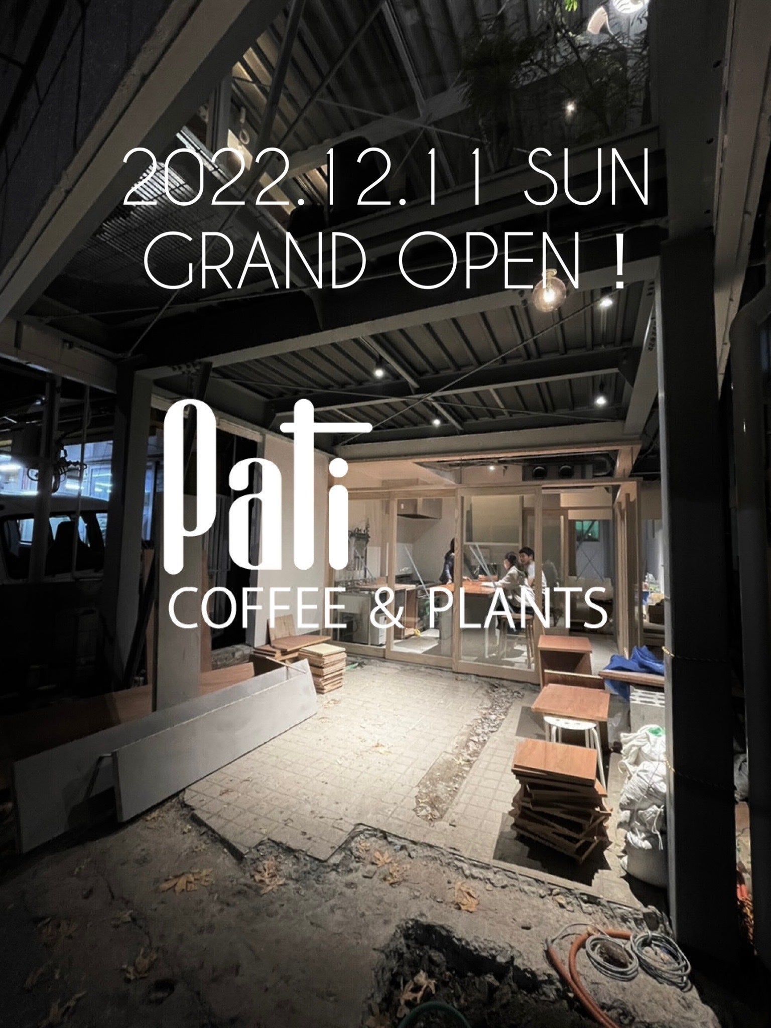 2022/12/06 21:13度々の変更、直前でのご報告で申し訳ありません。Pati nara改め、Pati coffee&plantsは12/11(日)にいよいよオープンいたします。当初の予定から随分遅くなってしまったこと、長らくご報告ができていなかったことを深くお詫び申し上げます。営業時間は8時から16時を予定しております。定休日は火曜日です。ご提供するメニューには、自家焙煎した豆で淹れるハンドドリップコーヒー、厳選した豆を使ったカフェラテ、紅茶、パイやスコーンをご用意する予定です!場所は、渋谷駅から最寄りのバス停までバスで15分、三軒茶屋駅から徒歩16分、下北沢駅から徒歩16分、池ノ上駅からは徒歩10分のところにあります。お越しいただいた際には、数量限定ですがもしよろしければPatiのロゴクッキーもリターンと一緒にお渡しいたします。是非、お越しいただければと思います。お待ちしております^^ もっと見るPati nara cafe オープン時期について
