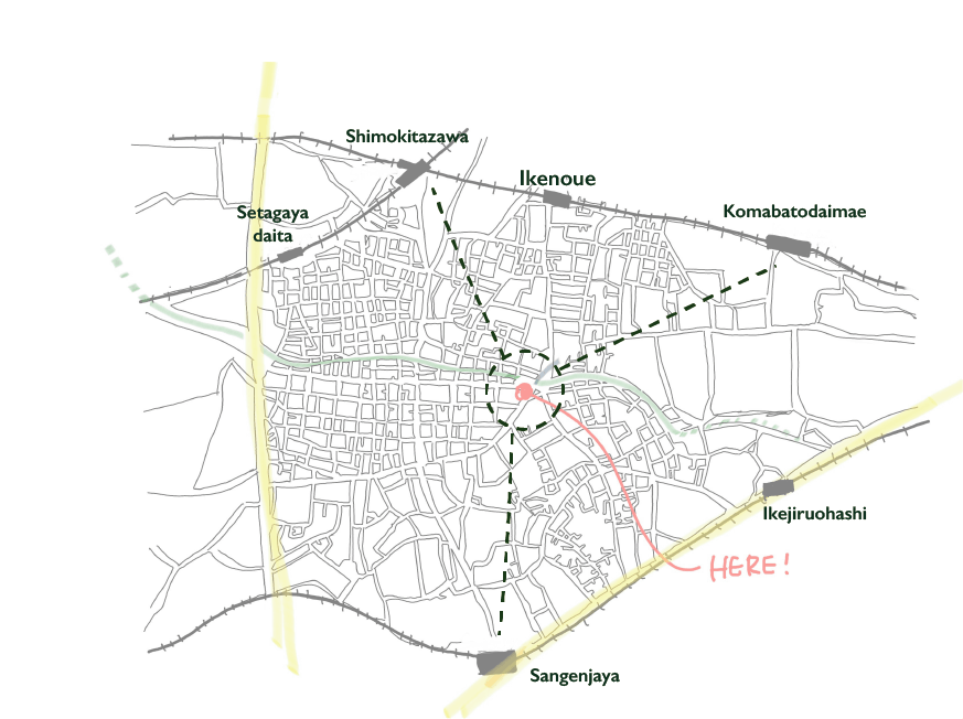 代沢という地域は、どの最寄り駅からも徒歩10分ほど離れた場所にありますが、 神社や公園、緑道があり、穏やかで心地の良い雰囲気のあるところです。 「Pati」のある淡島交差点は、下北沢から目黒をつなぐ北沢緑道に面しており、散歩やランニングスポットとして人気の憩いの場です。住民の皆さんや街歩きに訪れた方の散歩ルートの一部となり、地域の魅力となる事を目指しています。