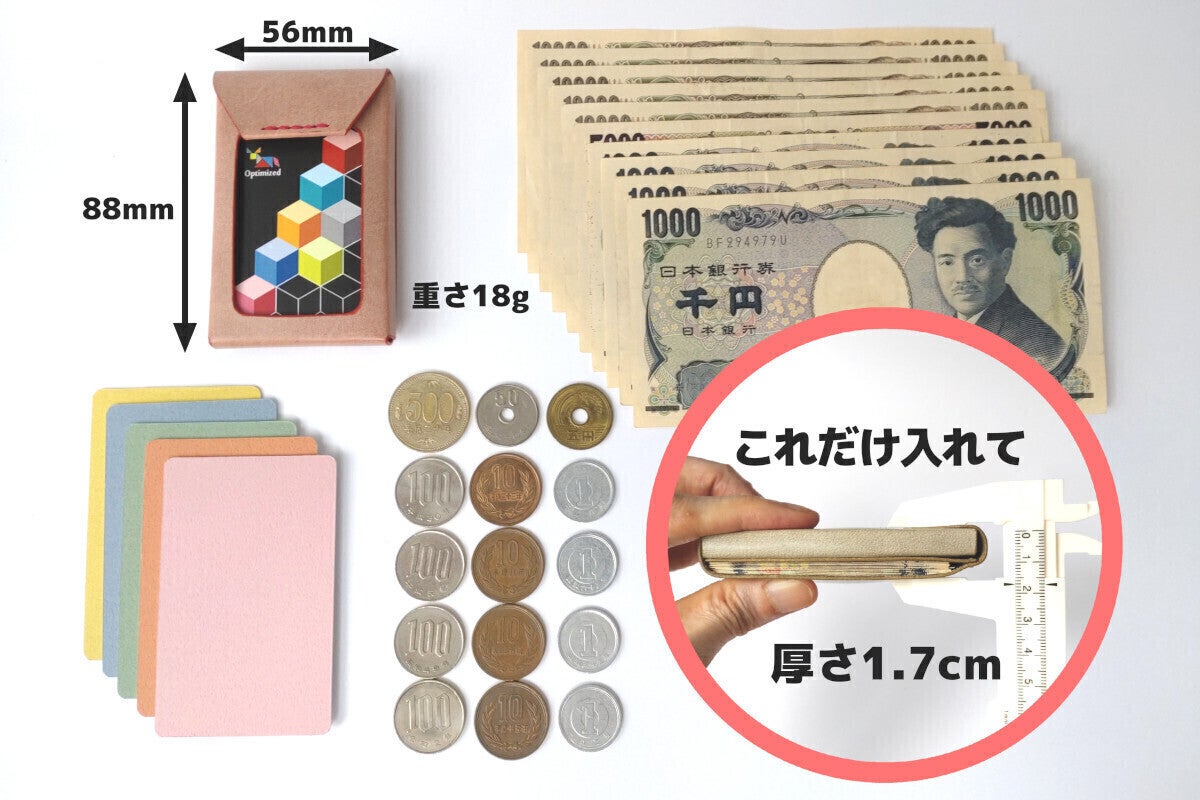 また、重さは約18グラムと、十円玉4枚分程度しかなく、革財布としては間違いなく最軽量クラスを実現しました。