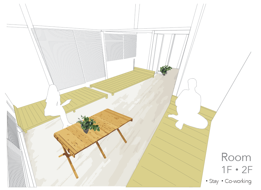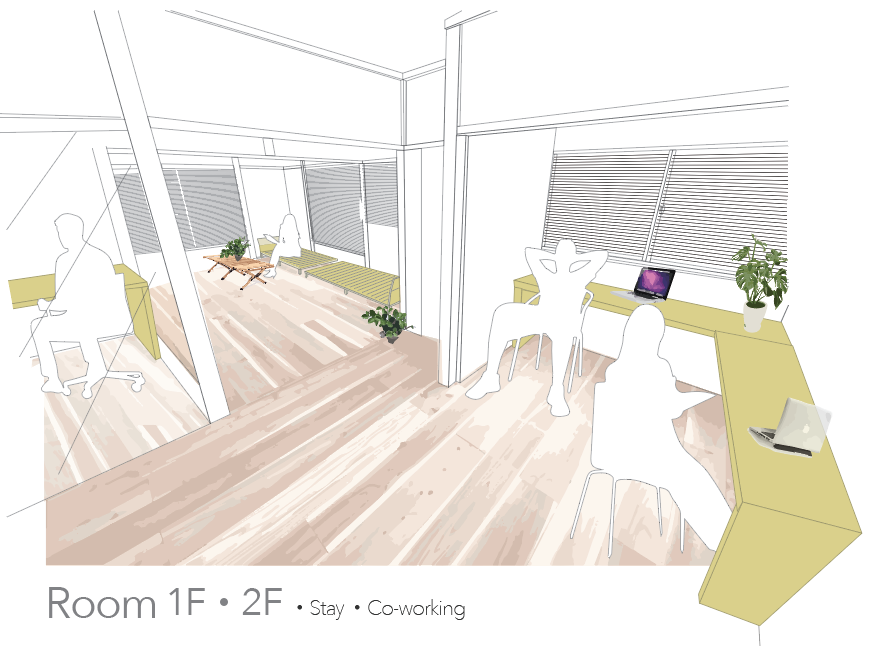 「宿泊室」入り口を背に見たイメージ。コワーキング可能な空間を作ります。