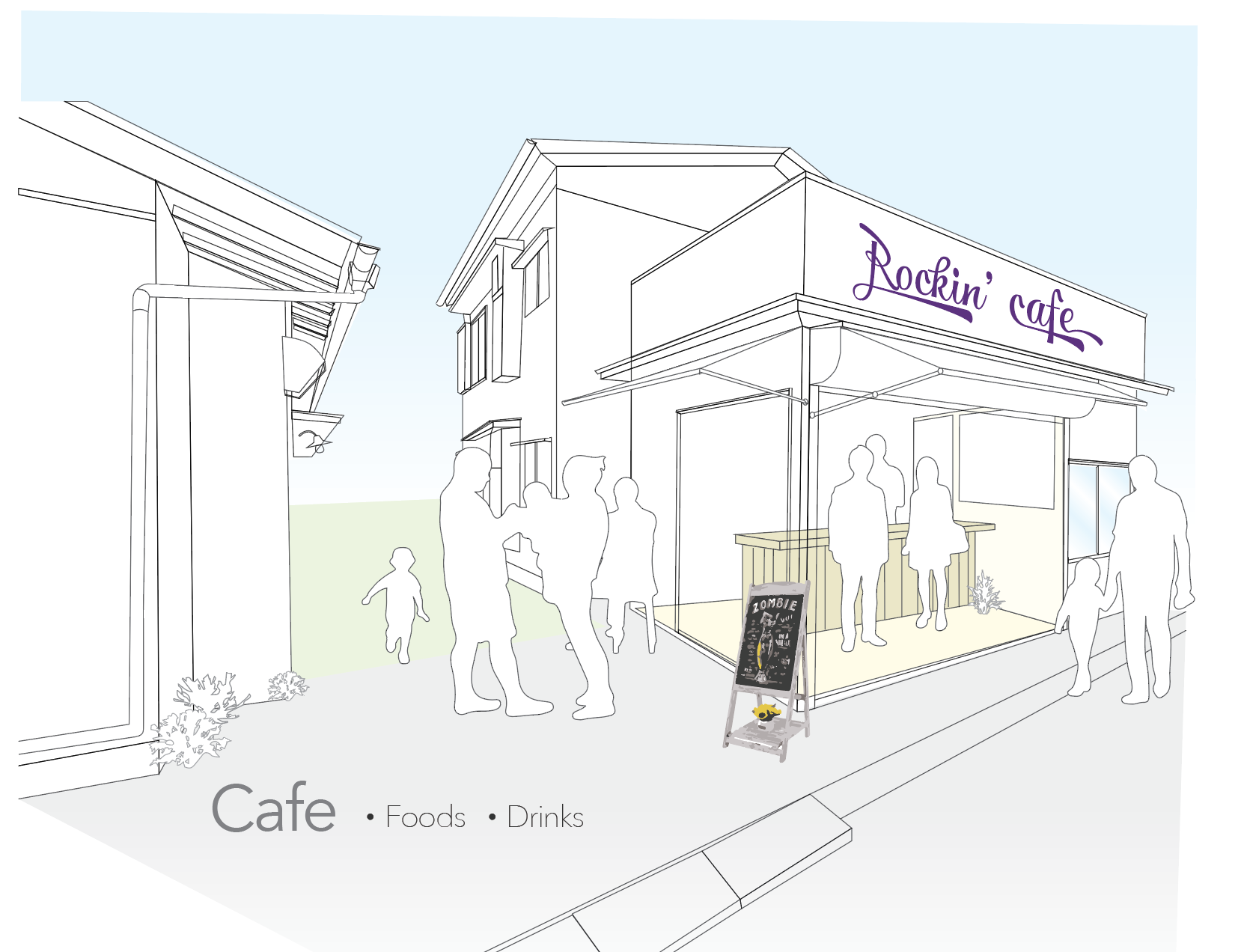 軽飲食を提供する「カフェ」イメージ。フリースペースのテーブルを使って飲食も可能にします。