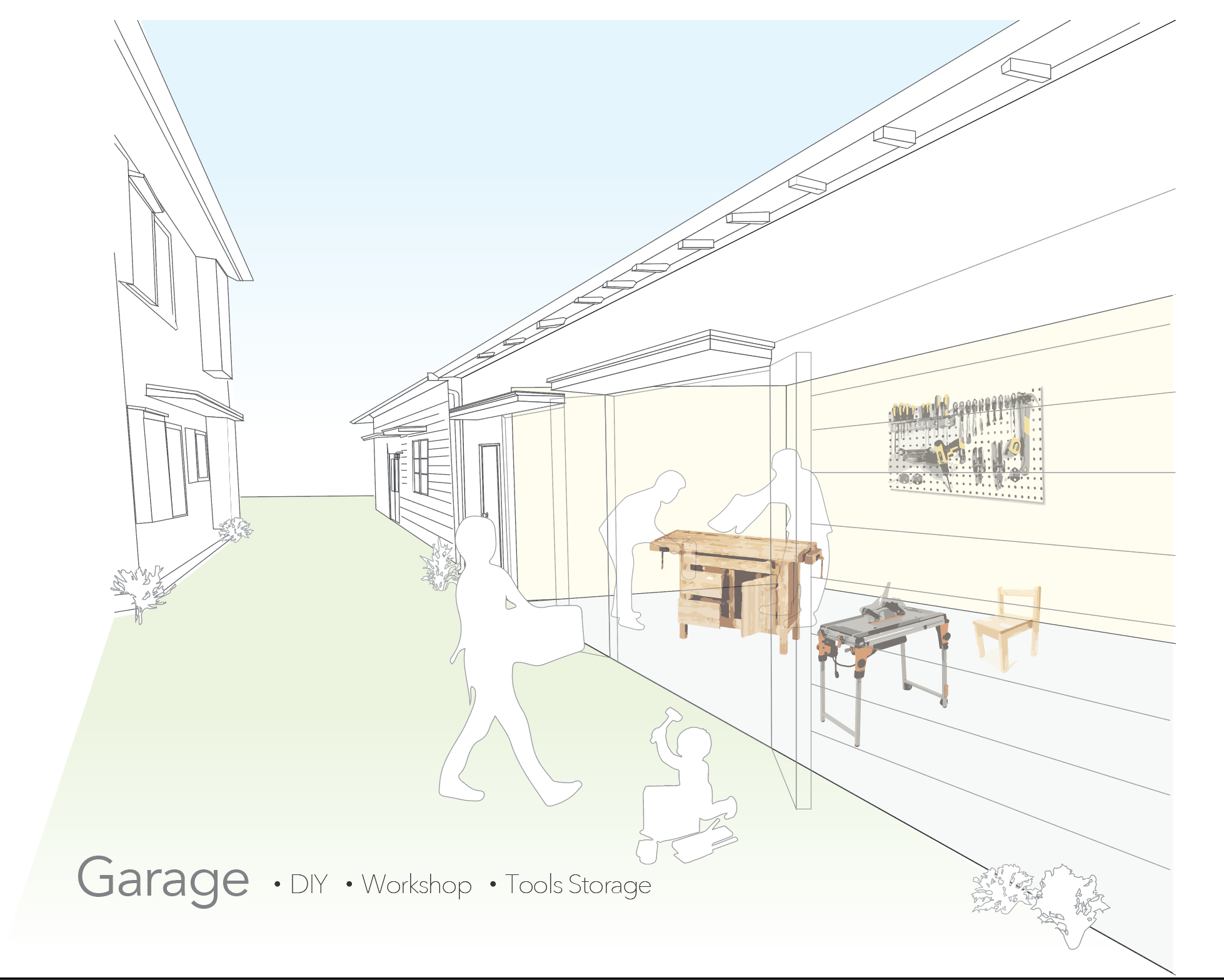 「DIYガレージ」を敷地奥から見たイメージ。様々な工作が行える施設を作ります。