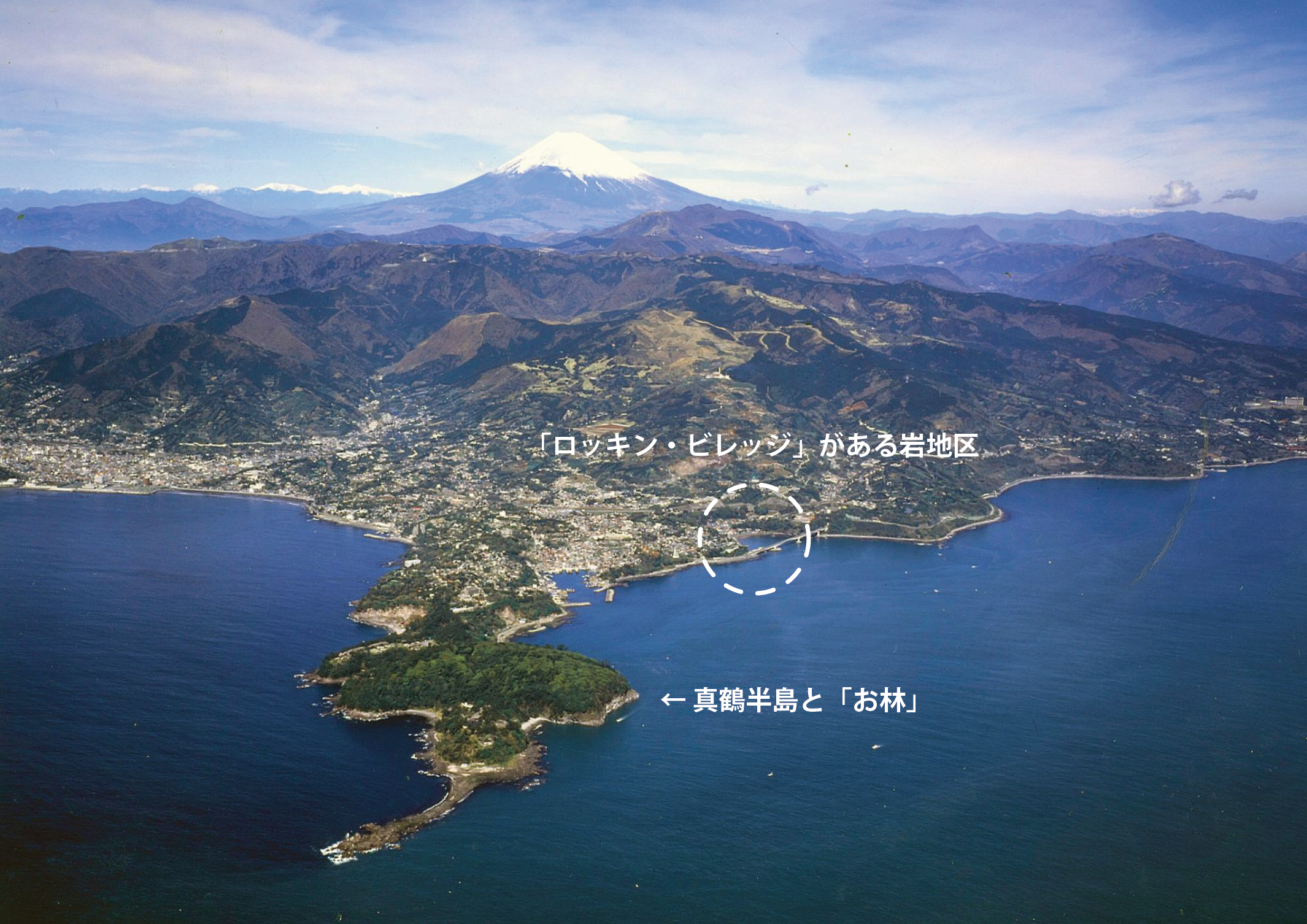 真鶴と言う地名の由来は、相模湾へ張り出す小さな半島が「鶴が飛ぶ」形をしていたことにあり、上空から真鶴半島を見ると、正に鶴が飛ぶ姿をしていることに驚かされます。