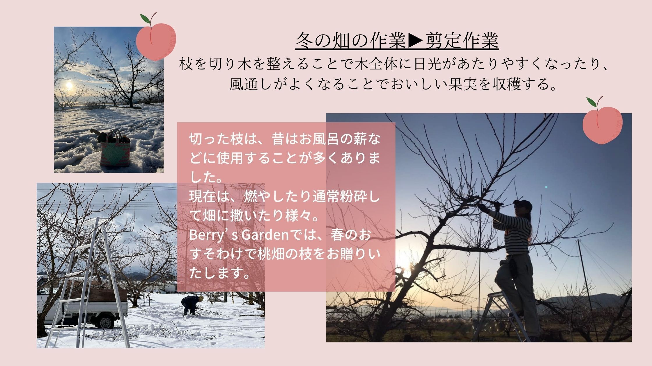 そんな桃畑より、Berry’ s Gardenでは、「春のおすそわけ」の気持ちでみなさまに桃畑の枝をお贈りいたします。