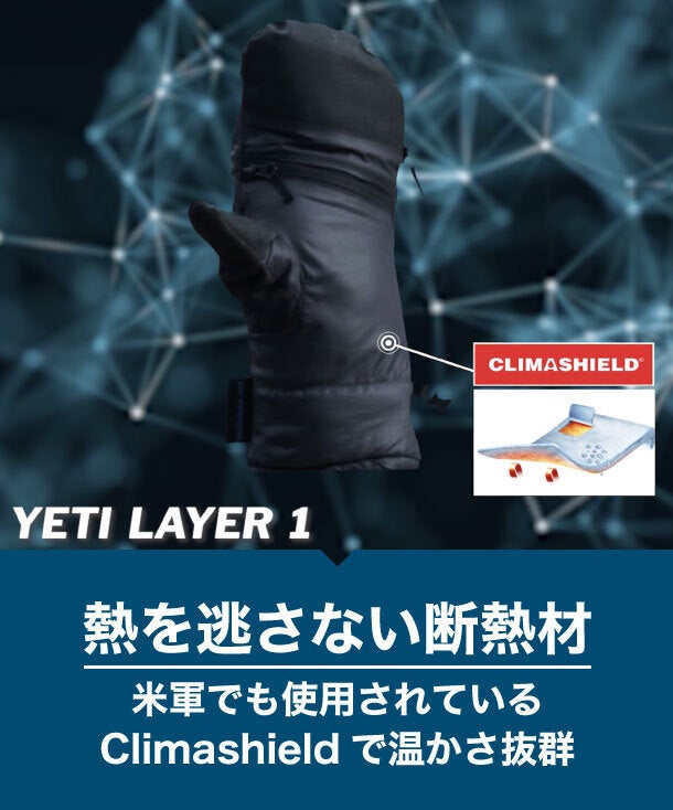 このClimashield APEX断熱材は米軍でも使用されるほどの優れた素材で、Yeti Mittsに使用しています。