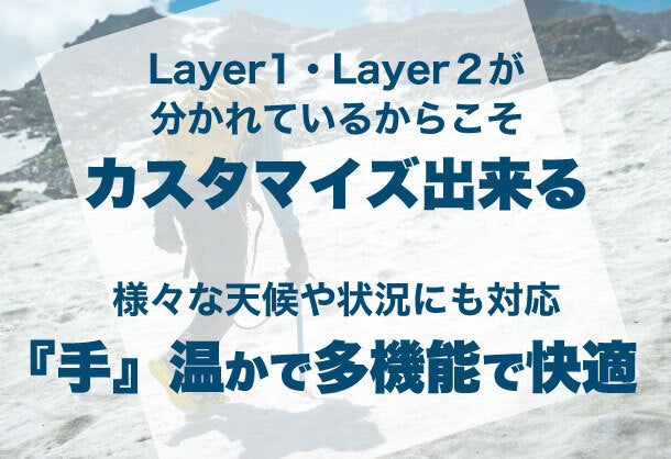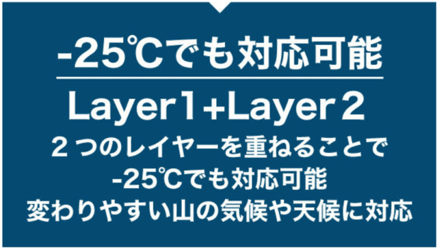 レイヤー1とレイヤー2を合わせた快適温度は-25℃ですが、さらに寒い時はカイロとインナーグローブを追加できます。