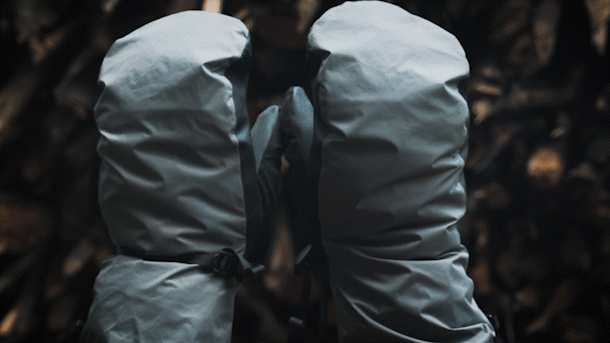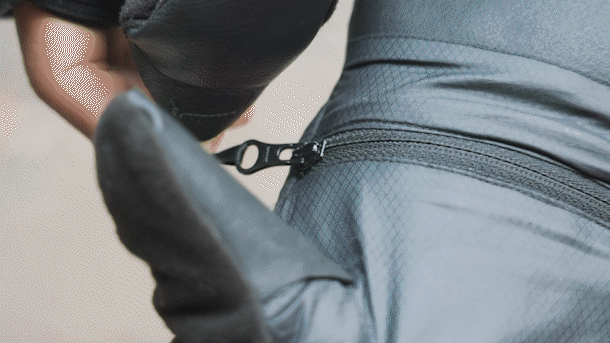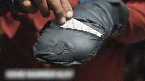 この「Climashield APEX」は空気を多く含むことができ、熱を逃さない優れた断熱材で、手から自然に発する熱によって暖められます。