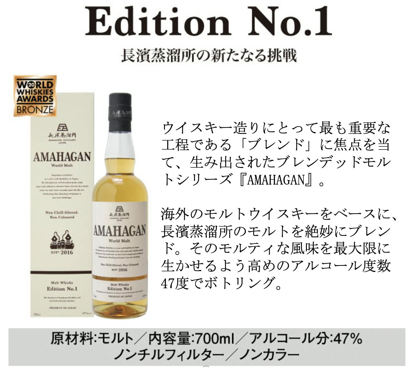 長濱蒸溜所を代表するウイスキーに「AMAHAGAN(アマハガン)」シリーズがあります。操業当時から様々なブレンディングを繰り返し、試行錯誤の末、2018年にシリーズ第1号となる「Edition No.1」をリリース。その後、同シリーズは、世界的なウイスキー品評会「World Whiskies Awards 2020」で、日本最高賞となる「Best Japanese Blended Malt」などを受賞しています。