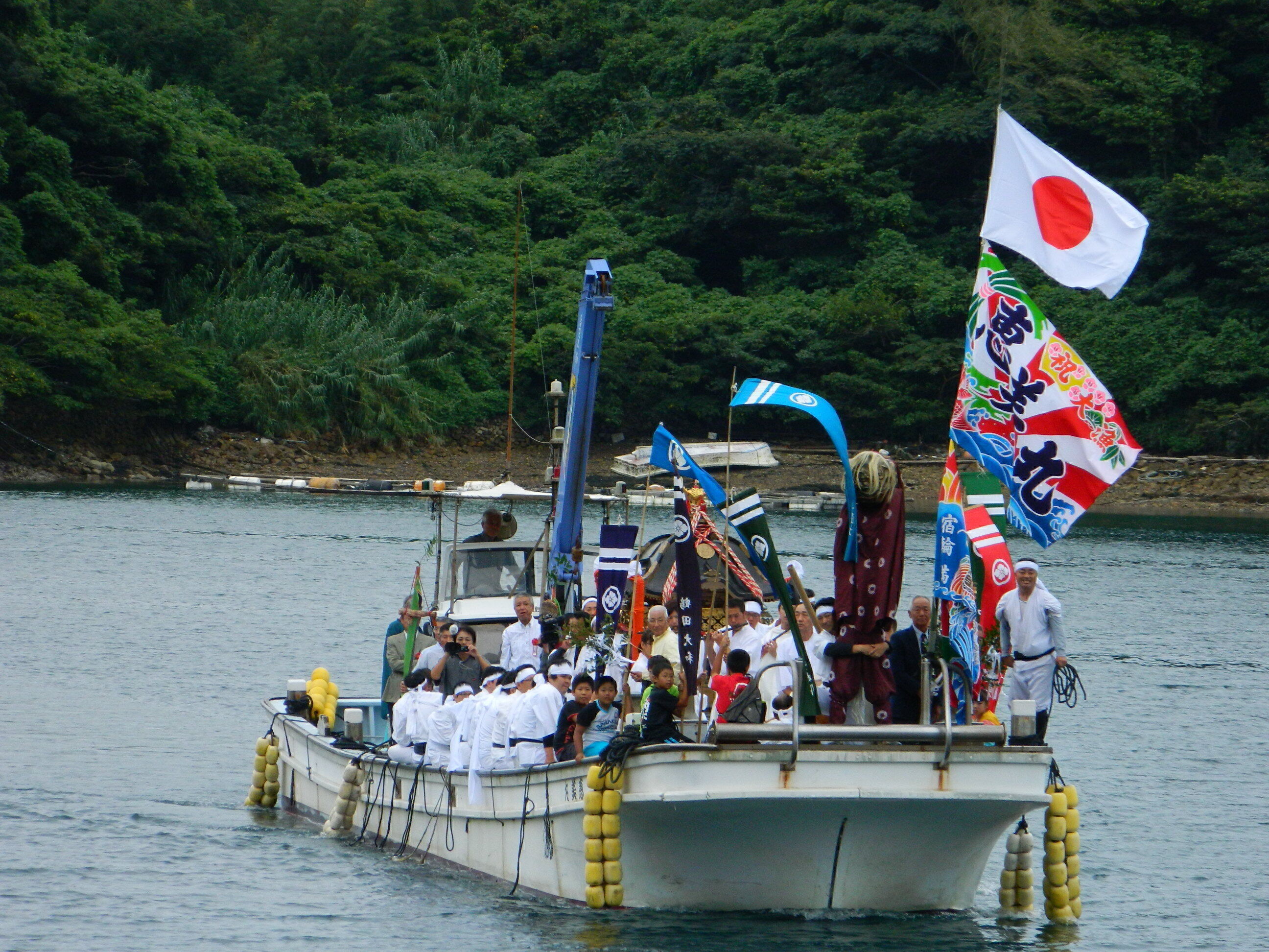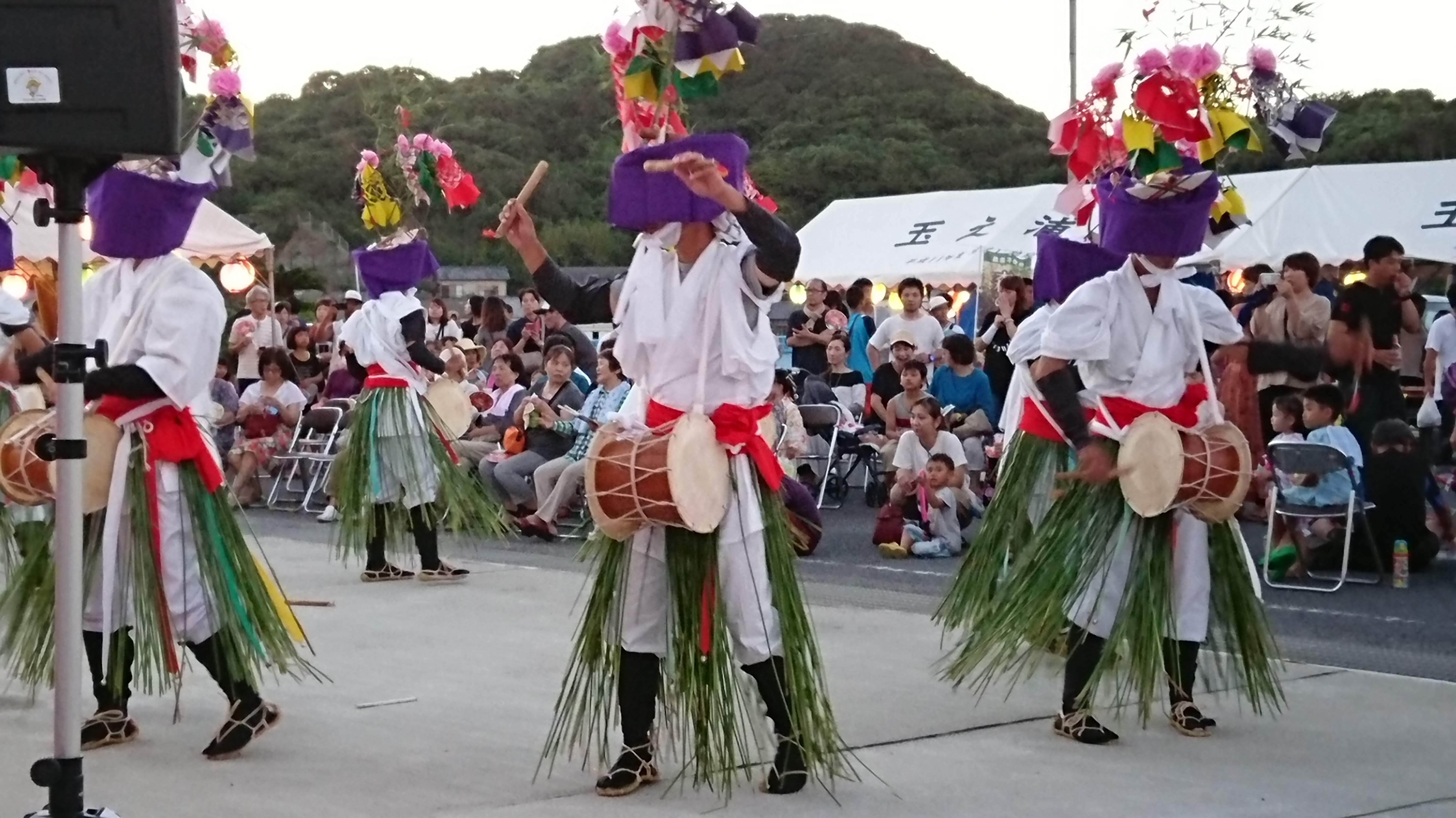 夏。祭りがあります。暦書にも残る遣唐使の記載。地域伝統は奈良時代以前から続く歴史の上にあります。念仏踊りを起源にした「カケ」踊りが地域の若者に受け継がれています。鐘と太鼓を鳴らしながら,一見滑稽なほど華やかな装束で踊る様は,見るほどに洗練された一挙一足の動きに感動し,優美にすら感じてきます。離れてしまった島出身者も祭りの日には島に戻り,過疎化して寂しくなった町もかつての賑わいを取り戻します。
