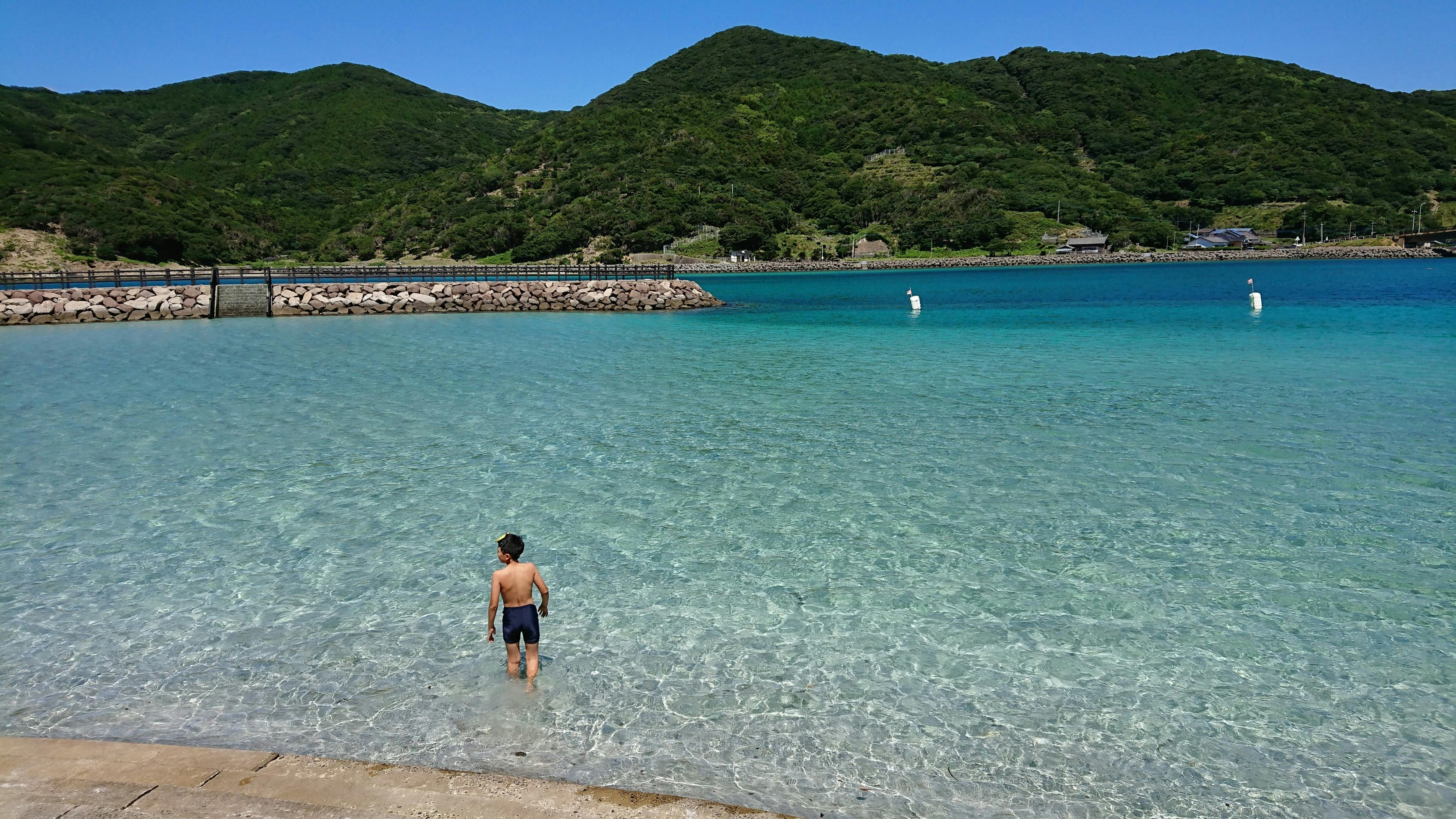 砂浜にいる強面のお兄さんたちに気兼ねしながら海で泳ぐ必要はありません。ビー玉を集めたような色の海を一人で楽しむこともできます。「お父さん貝殻が動いてる!お!ヤドカリだー!」とはしゃぐ子供たち。人目を気にする必要もありません。もしあなたが服のままでも泳ぎたいと思っても,誰もあなたを咎めることはしません。自由に好きなように遊べばいい。ここは大人だけでなく子供たちも安心して暮らせる町,それが玉之浦なのです。