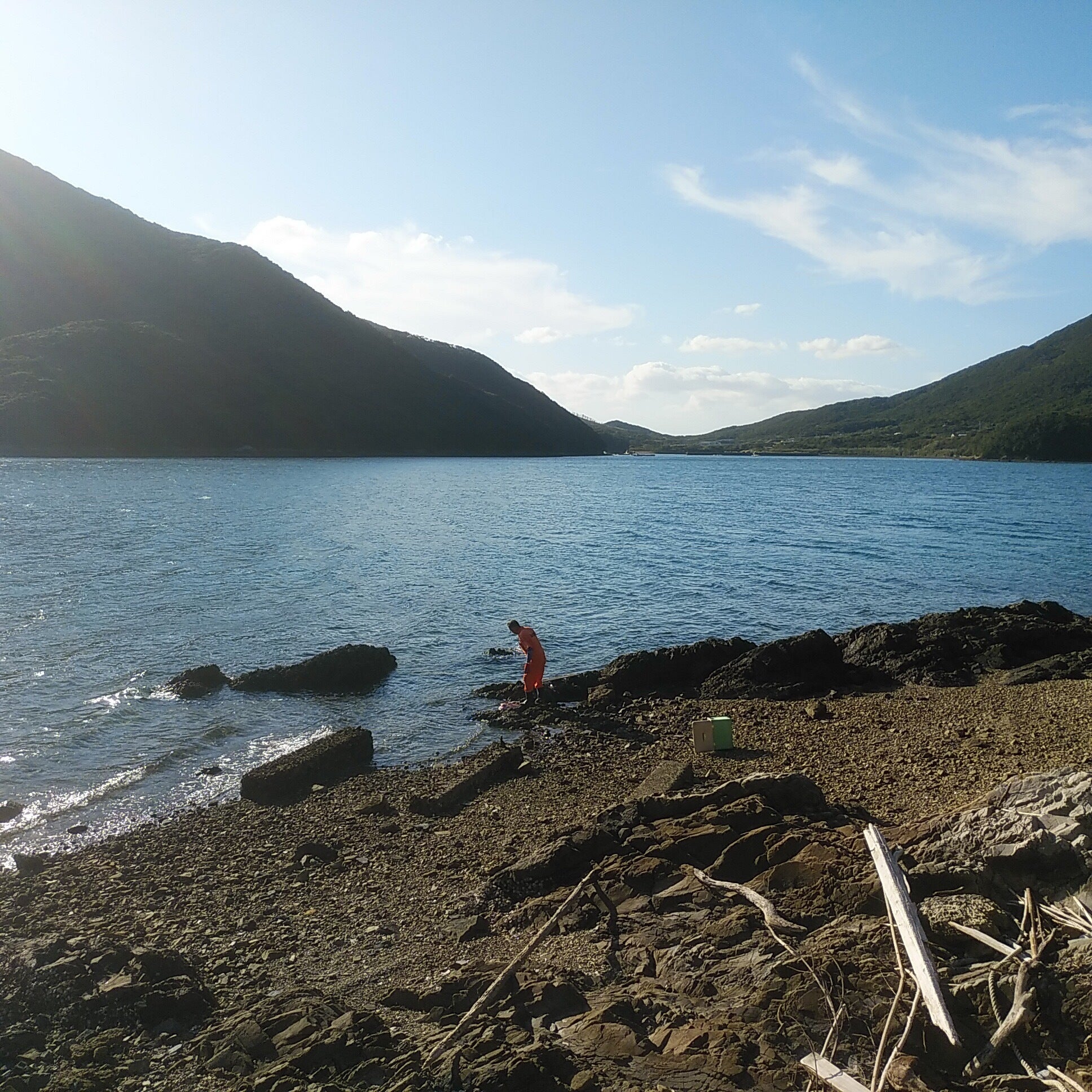 海辺に小さな軽車両が停まっていたので、防波堤から下の海岸を観ると。