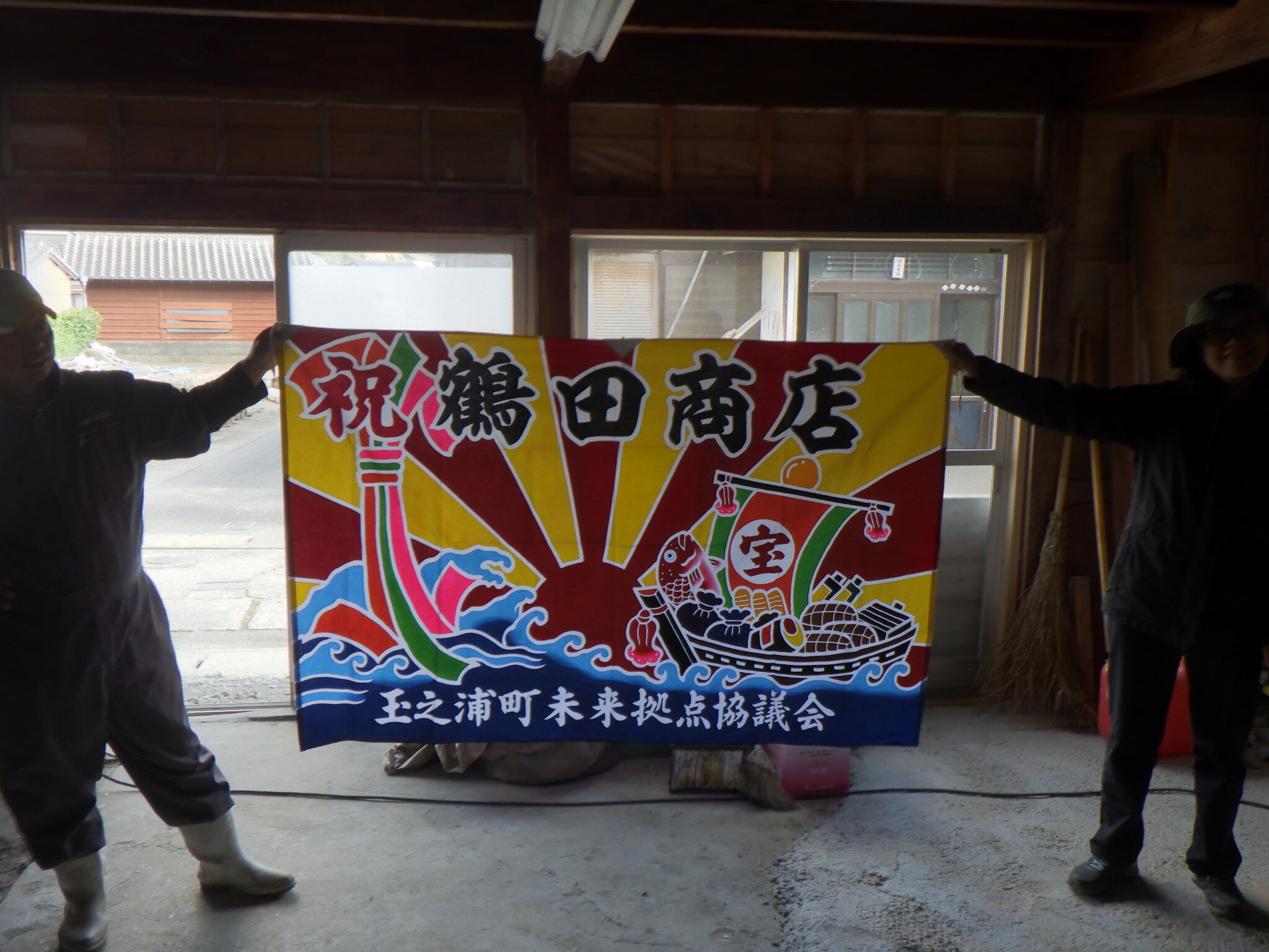 旧「鶴田商店」改築を進めながら、新たな船出を祝うということで、大漁旗をつくりました。これが返礼品にも紹介している大漁旗です。かっこいいでしょ?玉之浦は西端の町。描かれた太陽は夕陽です。夕陽の美しい町に宝を載せた船が港に戻ってくる姿を現しています。ちなみに写真の左に移っているのは、船長ですね。逆光で男前が写っていませんが、男前ですよ。さあ、よろず屋「鶴田商店」!! どんどん荒波を越えて地域に宝をもたらせる存在になっていきます!応援よろしくお願いします。