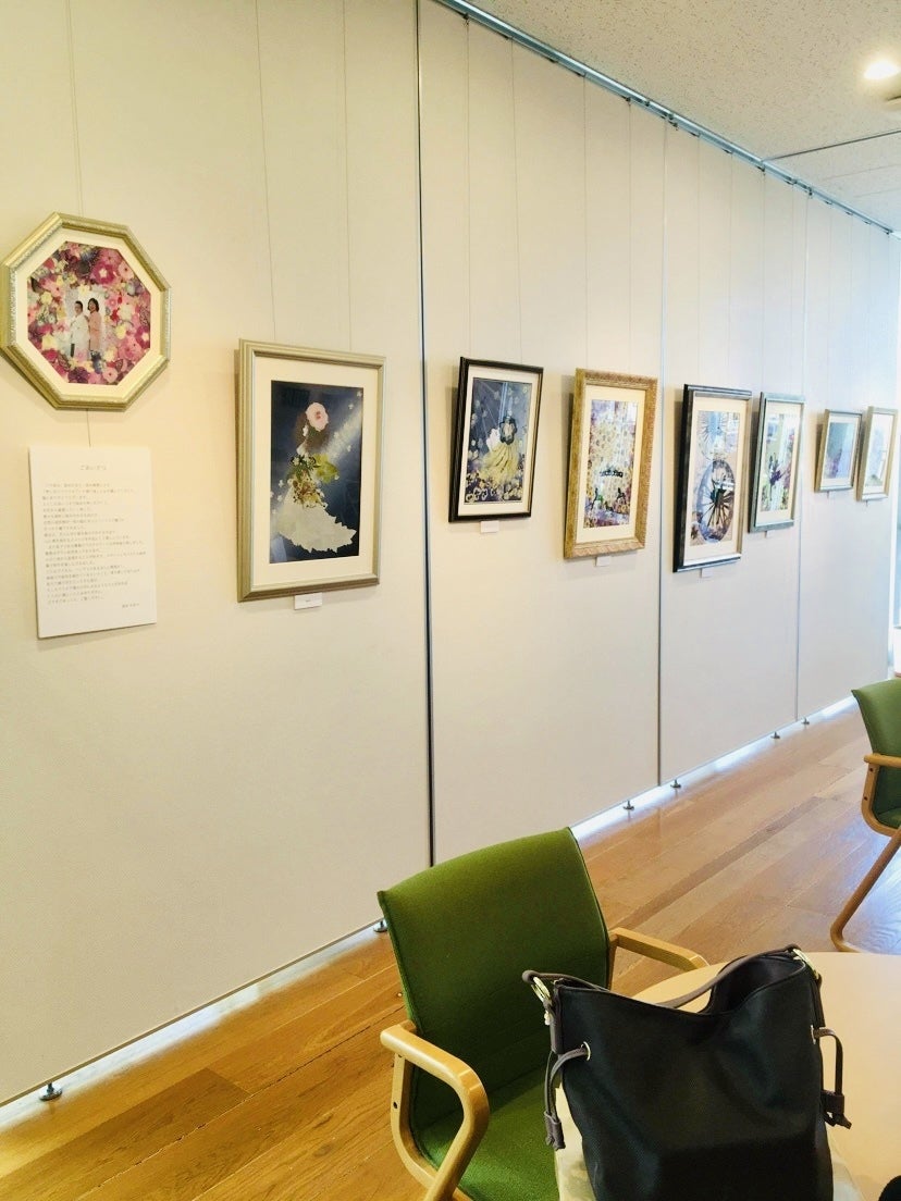 かをりさんの押し花作品は、切り絵や、着物の帯の刺繍や、キラキラのスワロフスキーなどを使った、とても独創的な作品です。そして、まーくんのパステルアートもまた、独特でいて調和の取れた、見る人を安心させる素晴らしい色使いと構図で、親子の作品が共に飾られることにより、相乗効果と申しますか、特別な空間が出来上がり、見る人を癒し、幸せな気持ちにしてくれます。