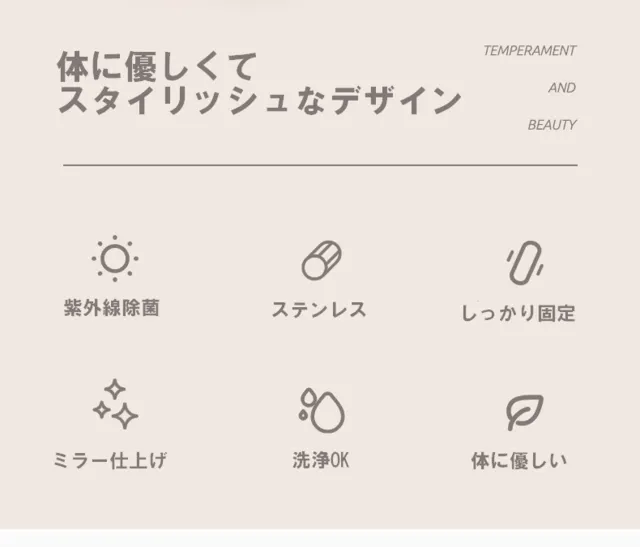 口との接触部を、ステンレスのSS304材を採用。SS304 は耐食性が高く、体に害が少ない素材で時計やアクセサリー、食器など人体と接触する商品によく使われていますので、安心して使用できます。