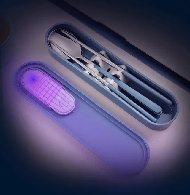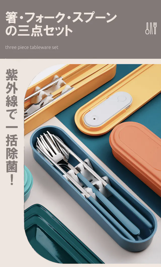 SafeEatは、ただの食器セットケースではなりません。一般的によく使われる箸、スプーン、フォークが入っていることはもちろん、紫外線パーツを中にセットすることができ、紫外線より除菌することが可能となります!