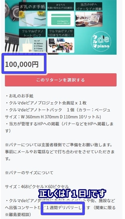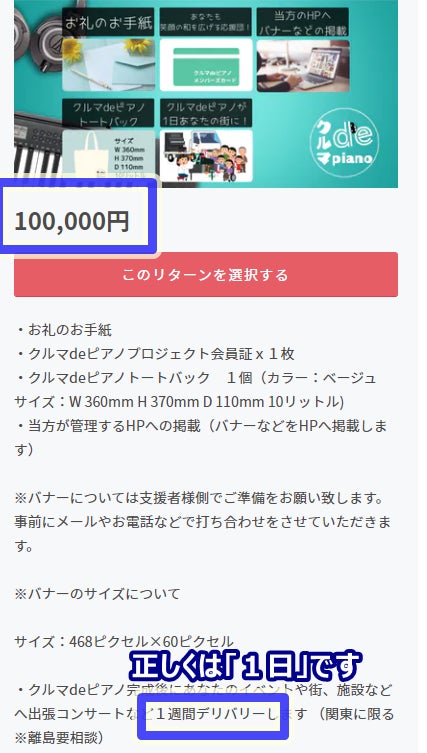 クルマdeピアノのデリバリー(関東のみ※離島要相談)が含まれておりますが、期間の部分に不備がございました。 プロジェクト本文及び、リターンの画像は「正」となっており、リターンの文章のみが「誤」となっております。