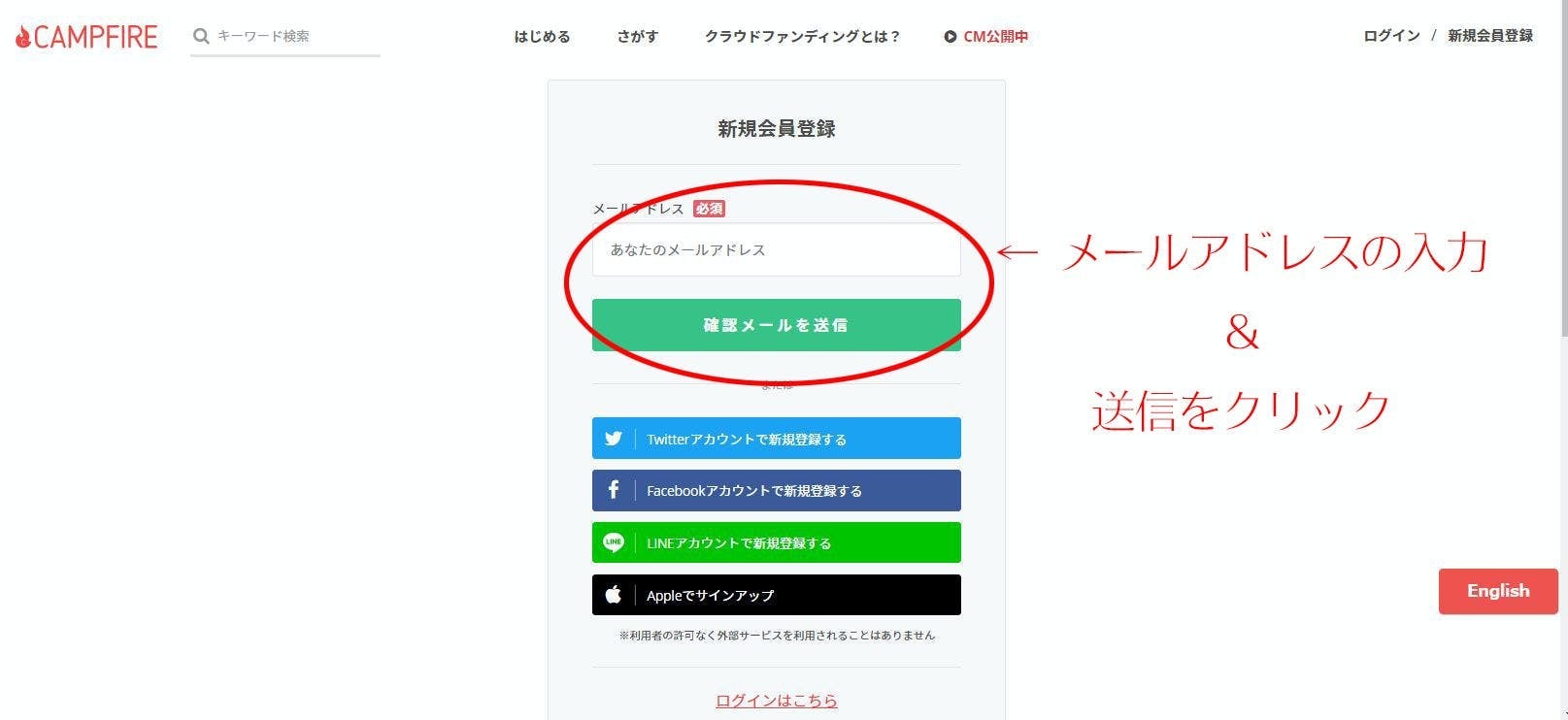 ③ 新規会員登録欄にメールアドレスを入力して、「確認メールを送信」ボタンを押す。