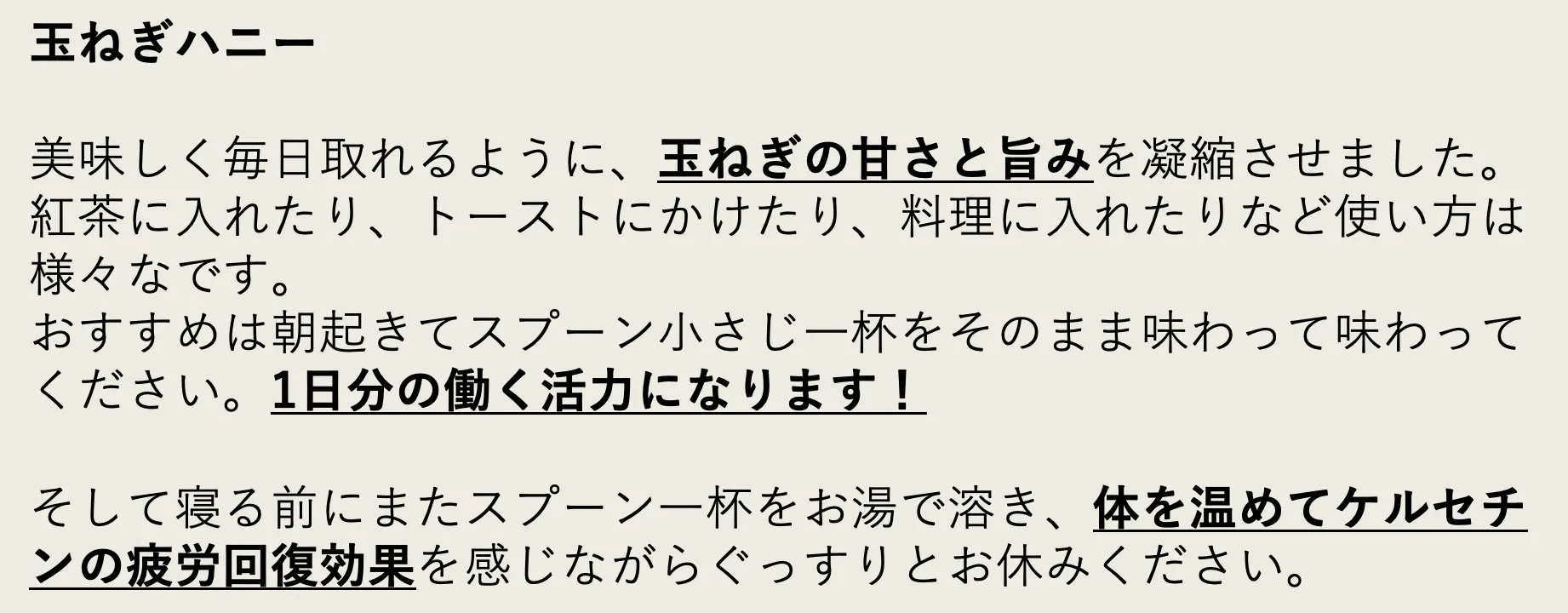 飲み続けることで、玉ねぎの持つ血液サラサラ効果、老化防止効果を実感して欲しいです。