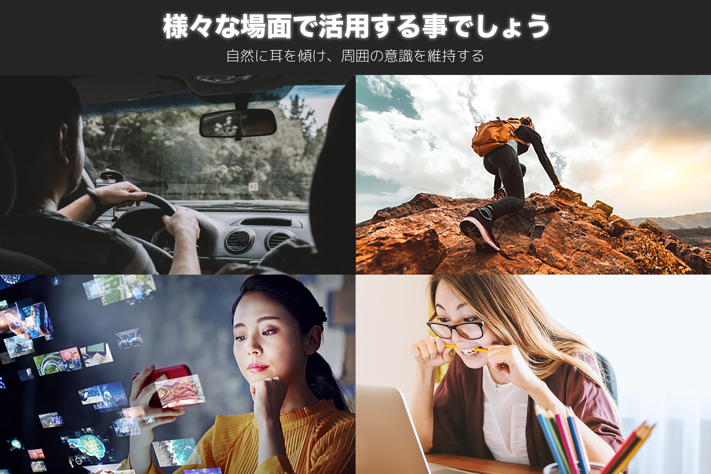 ・通話・リスニング・ドライブ・トレッキング・スポーツ・オンライン学校・テレワークなど、様々な場面で活躍でき、更には目と耳の融合でスマートなライフスタイルを送ることができます。