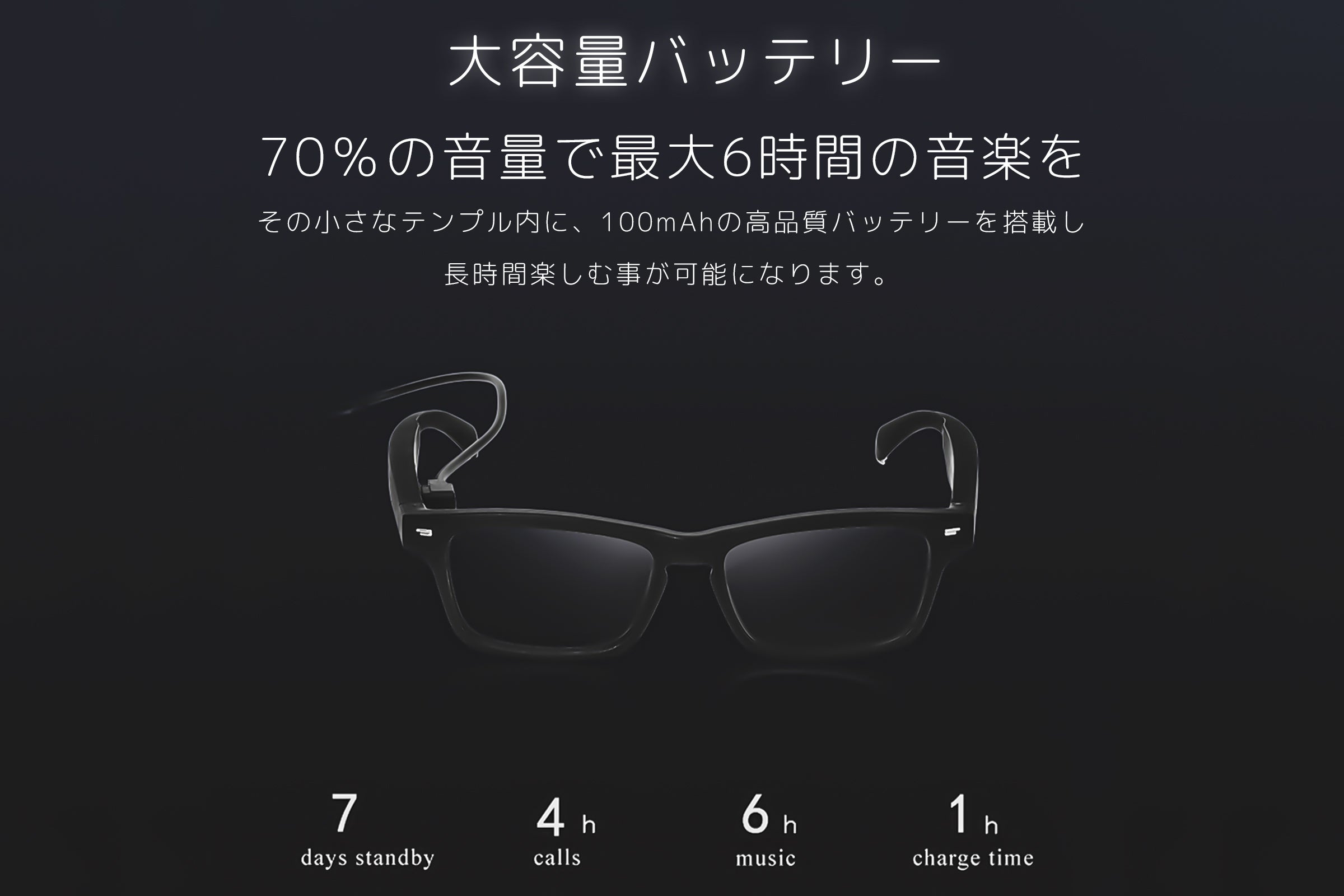 充電時間:1時間/通話時間:4時間/音楽:6時間/持続時間:7日間