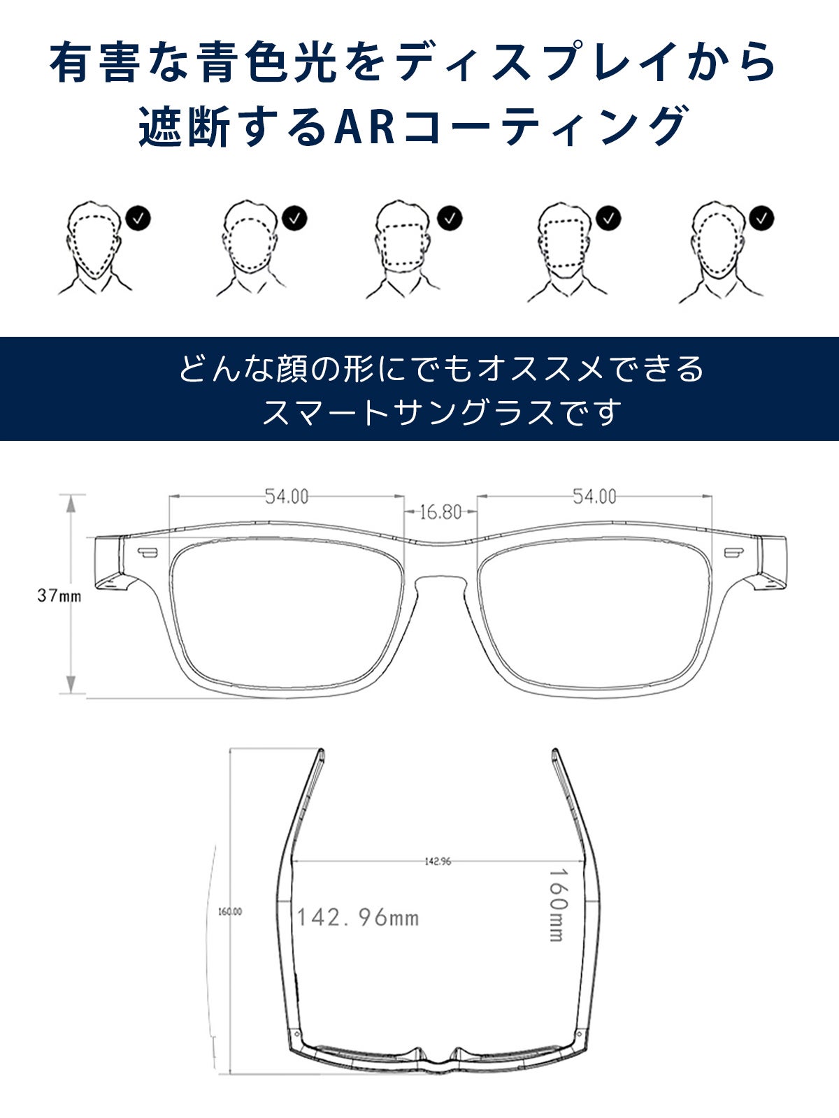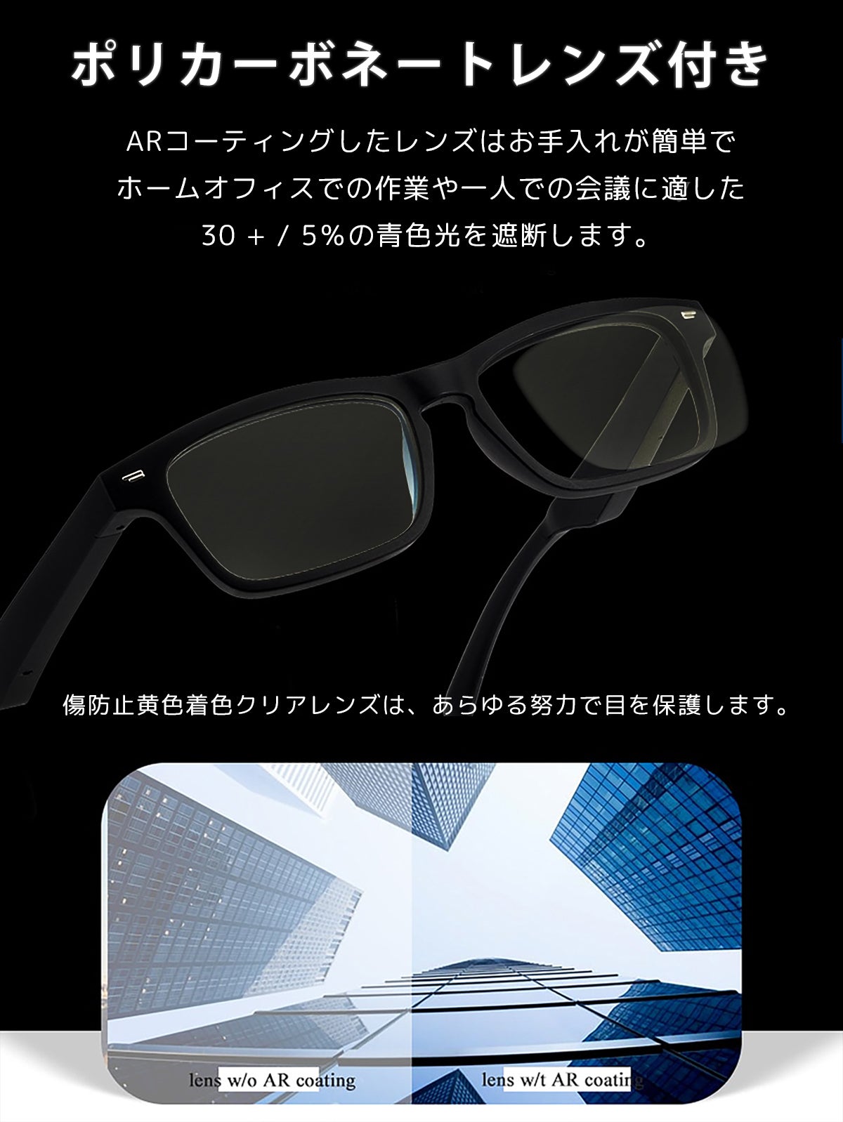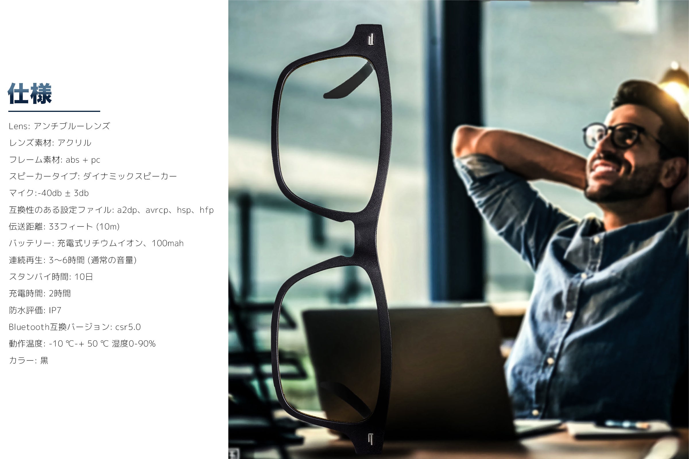 仕様レンズ:アンチブルーレンズ/レンズ素材:アクリル/フレーム素材:abs + pc/スピーカータイプ:ダイナミックスピーカー/マイク:-40db ± 3db/互換性のある設定ファイル:a2dp、avrcp、hsp、hfp/伝送距離:33フィート (10m)/バッテリー:充電式リチウムイオン、100mah/連続再生: 3〜6時間 (通常の音量)/スタンバイ時間:10日/充電時間:2時間/防水評価‥IP7/Bluetoothバージョン: CSR5.0/動作温度:-10 ℃-+ 50 ℃ 湿度0-90%/カラー:黒