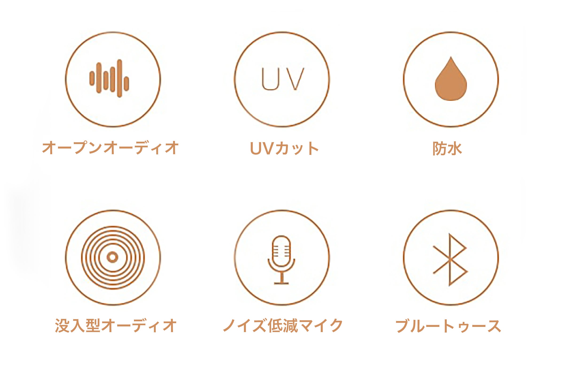 *オープンオーディオ:耳に何も着けない、サングラスで楽しむサウンド。自然なつけ心地で音楽に包まれる新感覚の開放型オーディオです*防水:粉塵からの保護。機器の正常な作動に支障をきたしたり、安全を損なう程の量の粉塵が内部に侵入しない。*没入感:他のことが気にならなくなるほど、ある対象や状況に意識を集中している感じ。 特に、音楽・映画・ゲームのほか、バーチャルリアリティー(VR)などで体験する感覚についていう。*ノイズ低減マイク:ノイズを除去(低減)する機能を搭載。*ブルートゥース:近距離規格が向上したことにより「通信範囲」「転送速度」が向上しました。