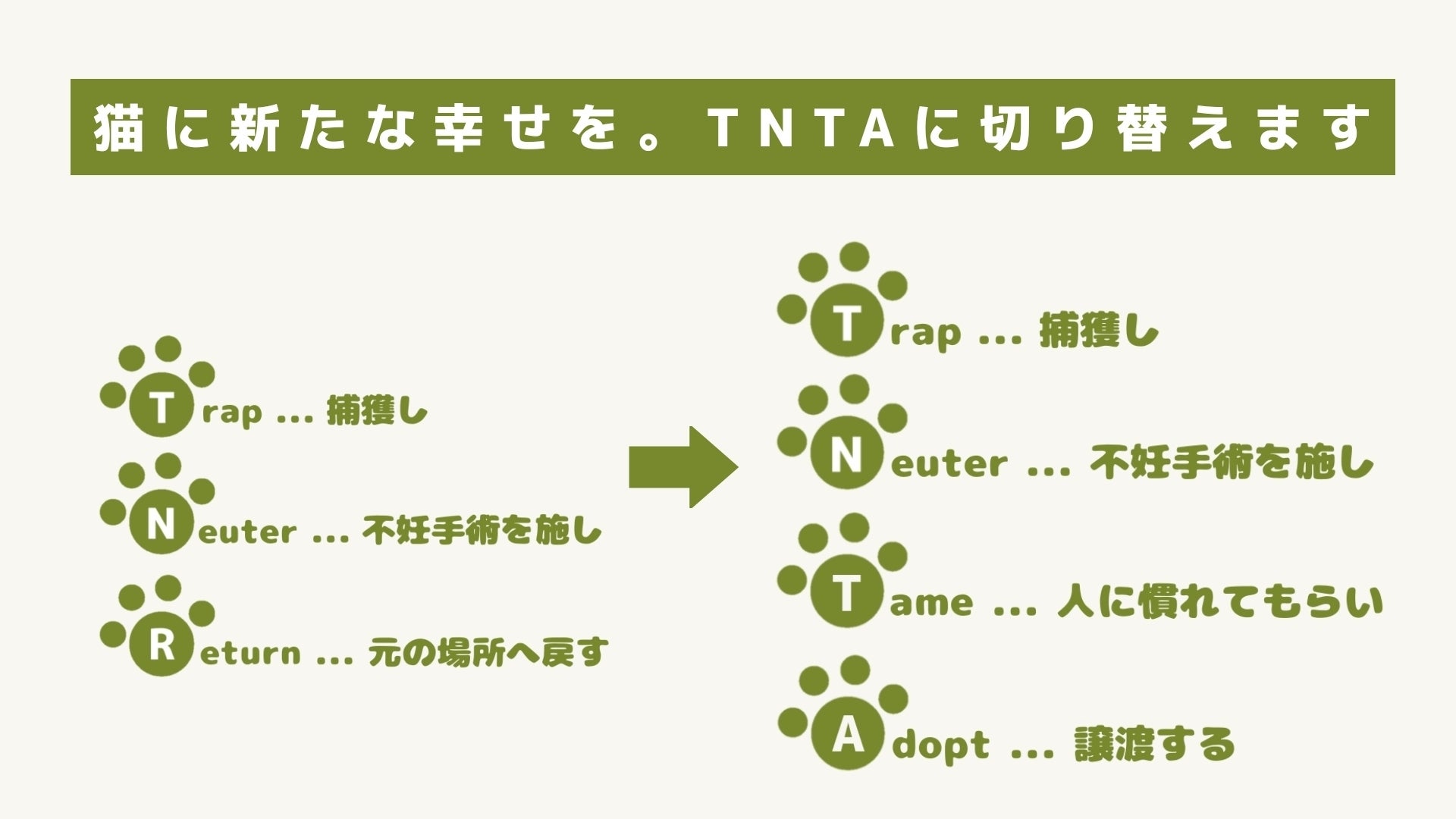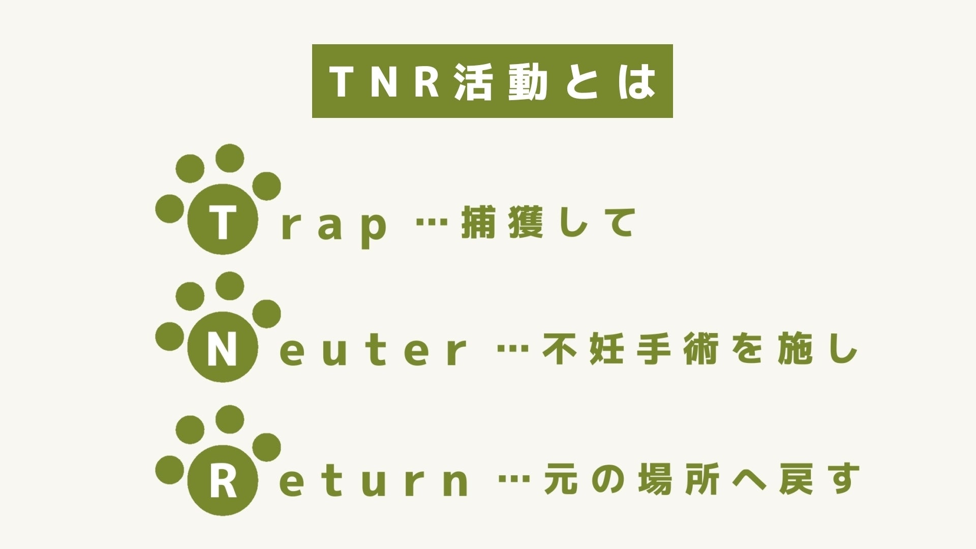 捕獲して、不妊手術を施し、人に慣れてもらい、譲渡する。