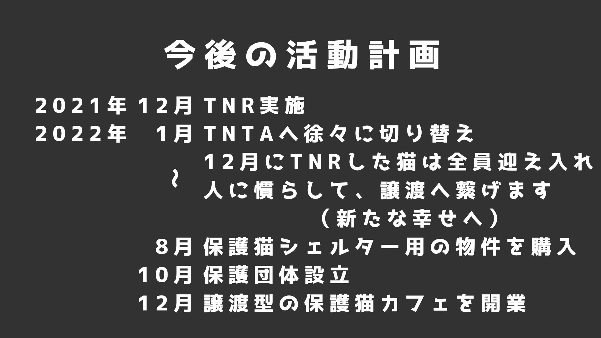 年内はTNR活動に注力し、来年からは今のお家よりも大きいところに拠点を移し、