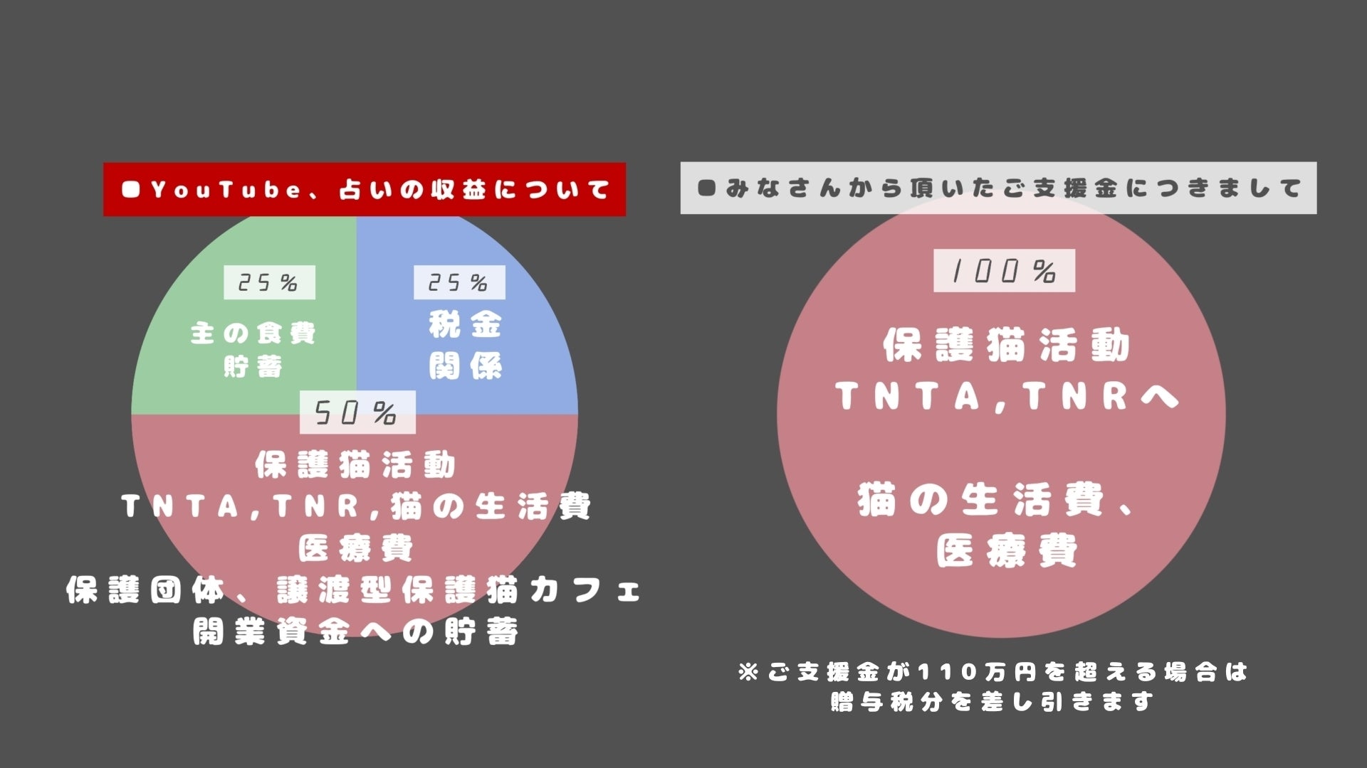 YouTubeや個人鑑定、グッズ販売等で得た収益は猫の生活へ充てております。