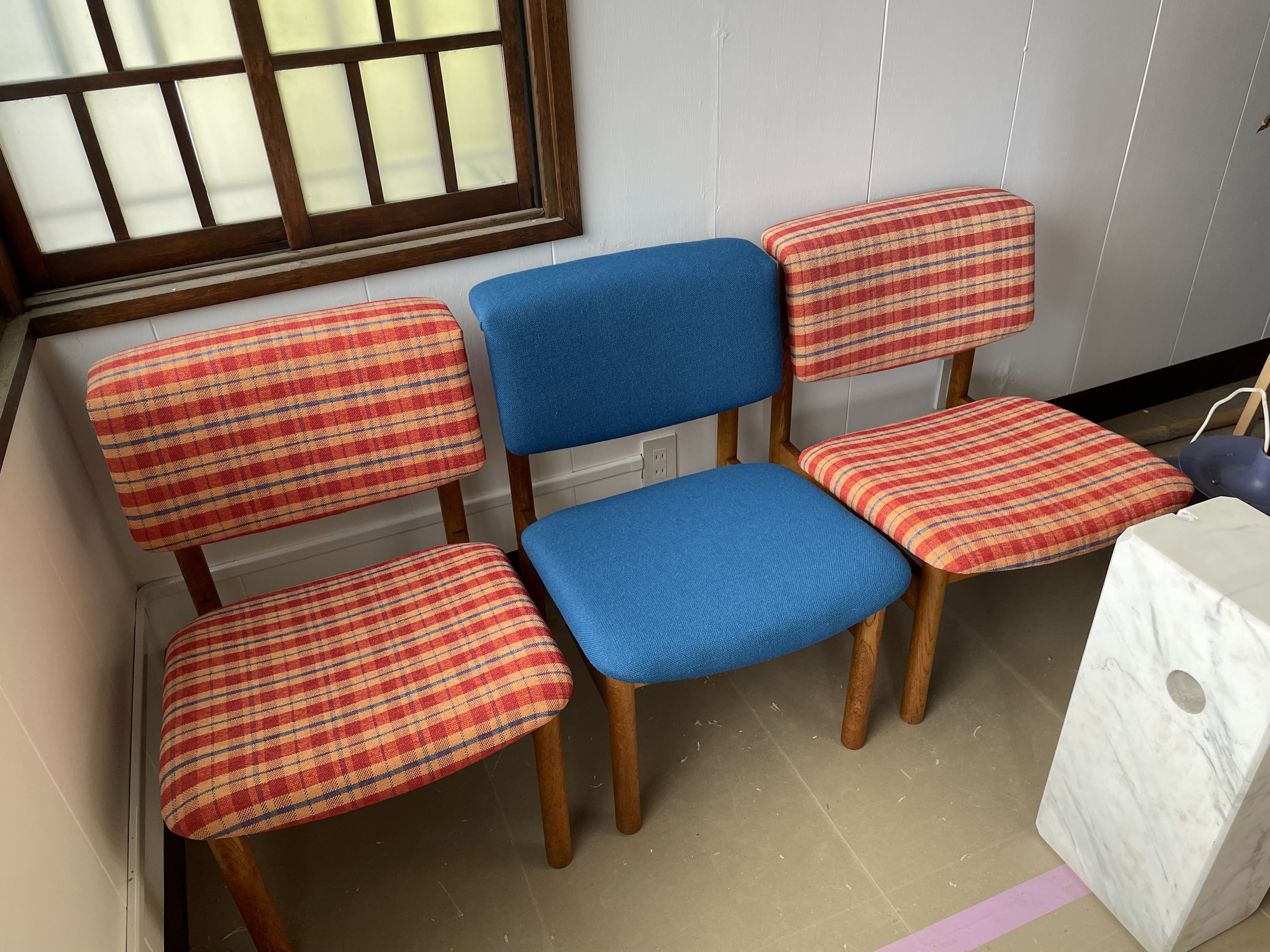 写真の椅子はロビー用の椅子で、生地の張り替えをしていただき本日搬入されました。こんなポップな柄や色が和の建物に実は映えると思います!