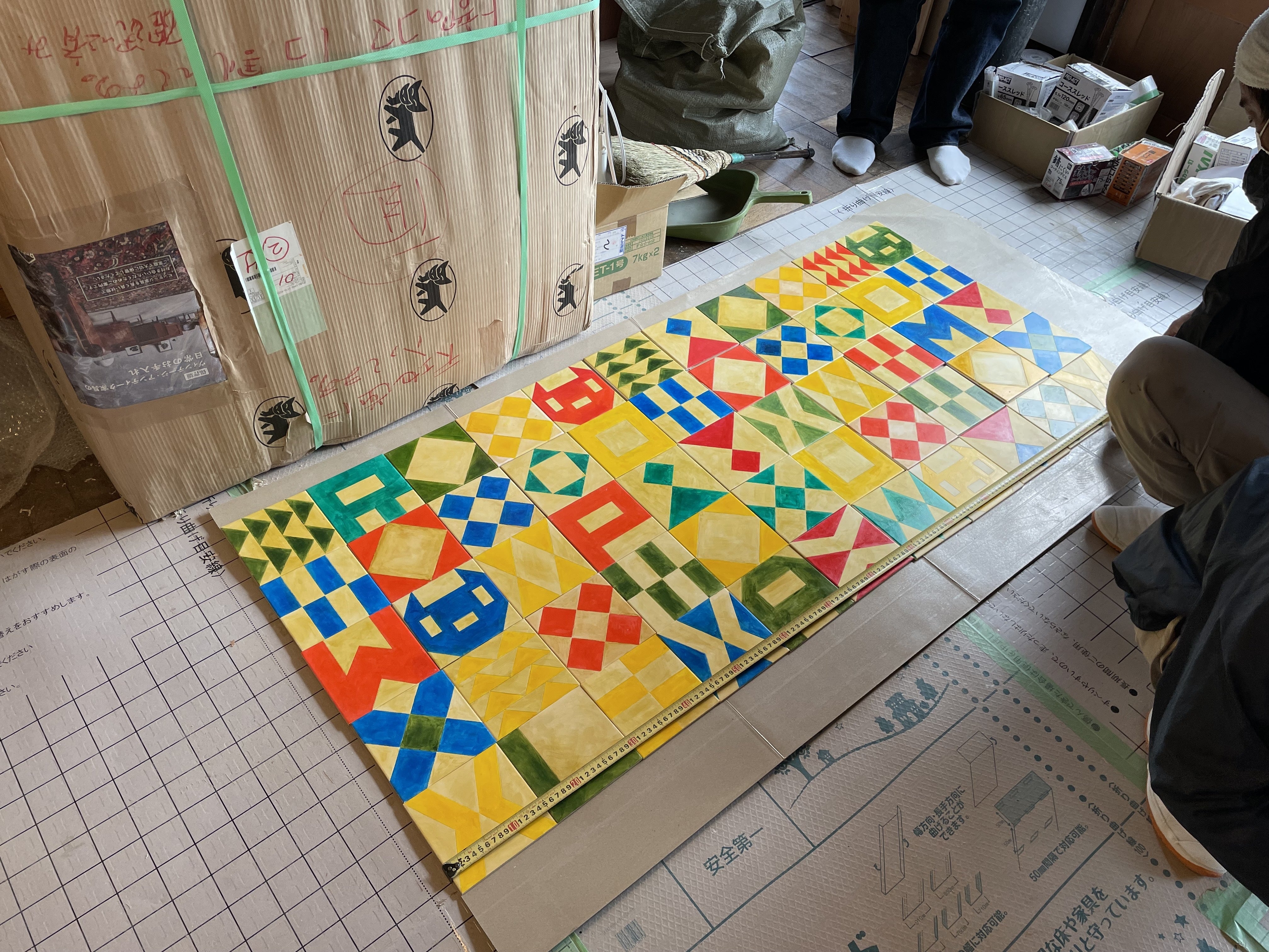 お風呂場の壁画のタイルも届きました!現在職人さんに貼り付けしてもらってます 小田原にゆかりのあるモチーフや文字が隠されてるので、現物をみに来てください 一枚一枚が味があるので、お風呂に入りながら眺めるのも楽しみです!
